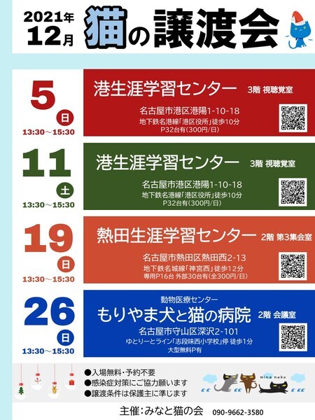 | イベント内容 | =みなと猫の会 第313回譲渡会のお知らせ== 長いお休み期間は猫と仲良くなる絶好のチャンスです ◆ペットショップへ行く前にぜひ譲渡会へ◆ 寒い冬は猫と一緒にぬくぬく暖まりませんか ○主 催 みなと猫の会 ○日 時 12月26日(日) 13:30~15:30 ○場 所 動物医療センターもりやま犬と猫の病院 新館2F 会議室 名古屋市守山区深沢2-101 ゆとりーとライン 志段味西小学校バス停留所 徒歩2分 【会場Map】https://goo.gl/maps/oPzQu3PWqE32 ○車でお越しの場合は 病院第1~3駐車場をご利用ください ○お問い合わせは会場ではなく minatonekonokai@gmail.comもしくは 090-9662-3580 までお願いします ○参加猫について ・参加している猫は、ワクチンや駆虫等の基本治療を済ませています。 また、年齢に応じて避妊去勢手術を行っています。 ・参加予定猫が体調不良などで急遽不参加になることもあります。 ○参加猫一覧 http://minatoneko2014.blog.fc2.com/blog-entry-1615.html ○ご来場の皆様へ ・譲渡会の見学は予約不要・入場無料です。 ・当日に猫をお渡しすることはありません。 後日ご自宅までお届けに伺います。 ・一週間から二週間のトライアル期間後、正式譲渡となります。 ・トライアル及び譲渡の際には 完全室内飼い・ご家族の同意・脱走防止策・ アンケート記入など諸条件がございます。 ・里親様には治療費の一部ご負担をお願いしております。 これ以上不幸な猫を増やさないための 治療費とさせて頂きますので何卒ご理解ください。 ・非会員の個人保護者も参加しています。 譲渡条件やトライアルは猫の保護者に準じます。 ・譲渡会の流れ http://minatoneko2014.blog.fc2.com/blog-entry-11.html ○参加猫情報は随時更新中! http://minatoneko2014.blog.fc2.com/blog-entry-493.html ○猫に関する相談も受け付けています ねこについての困りごと、トラブルなどを抱えている方、 相談へいらっしゃいませんか。 ○次回以降の譲渡会予定 日時:2022年1月9日(日) 13:30-15:30 場所:港生涯学習センター 3階 視聴覚室 名古屋市港区港陽1-10-18 地下鉄名港線「港区役所」駅より徒歩10分 日時:2022年1月16日(日) 13:30-15:30 場所:港生涯学習センター 3階 視聴覚室 名古屋市港区港陽1-10-18 地下鉄名港線「港区役所」駅より徒歩10分 日時:2022年1月23日(日) 13:30-15:30 場所:動物医療センター もりやま犬と猫の病院 新館2階 会議室 愛知県名古屋市守山区深沢2-101 ゆとりーとライン「志段味西小学校」バス停留所 徒歩2分 日時:2022年1月30日(日) 13:30-15:30 場所:熱田生涯学習センター 2階 第3集会室 名古屋市熱田区熱田西町2-13 地下鉄名城線地下鉄「神宮西」駅より徒歩12分 ◎主催者ブログ みなと猫の会 ~こぴっと猫だより~ http://minatoneko2014.blog.fc2.com/ ■上記ブログに会ってみたい猫がいた!でも参加予定猫に入ってない、 どうすればいいの? ■譲渡会当日は都合が悪くて… それ以外の日に猫とお見合いがしたい! などのお問い合わせは minatonekonokai@gmail.com まで 〇感染症の拡大防止にご協力願います ※会場入出時の手指消毒にご協力ください ※定期的に換気作業を行います ※マスク等の使用をお願いいたします 写真1枚目 きし君 ♂ 3ヵ月 人見知りゼロの気さくな男の子 写真2枚目 くき ♂ 3ヵ月 フレンドリーで愛嬌たっぷりです ☆★個性豊かな猫たちが皆様をお迎えします★☆ 猫とスタッフ一同、お待ちしております。 |