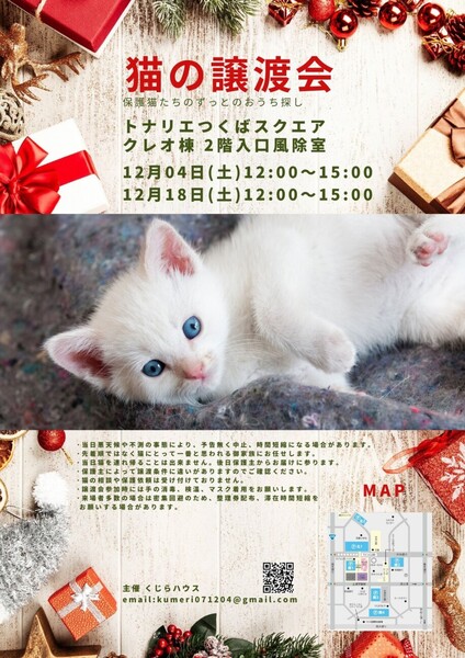 | イベント内容 | 猫の譲渡会を開催します。 今回は臨時ですがいつもは蚤の市と同時に開催しているのでゆっくりとお話できるかと思います。 個人の保護主が集まり保護猫達のずっとのおうちを探しています。1頭1頭その子のストーリーがあり、お外で過酷な環境で生きてきました。 寒くなるこの季節にあたたかい家族とずっと一緒に過ごせます様に。 保護猫を1頭お迎えすることで、その空いた席にもう1頭保護できます。同時に2頭救える様に是非ご家族揃ってお越しください。 可愛らしい子猫、ハンデのある子、落ち着いた大人猫と参加猫は様々です。ライフスタイルに合った猫を探してください。 子犬も参加します。小型犬では無いので家族で良く相談の上お申し込みください。 会場ではチャリティー品販売も行っております。お買い物で猫達を助ける事に繋がります。 またご家庭で不要になったドライフード(未開封)や、中古のタオル(洗濯済)を会場にお持ちくださると助かります。茨城県動物指導センターに寄付したり、保護猫たちのために使用させて頂きます。 沢山のご来場をお待ちしております! |