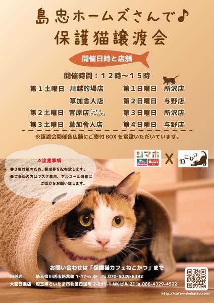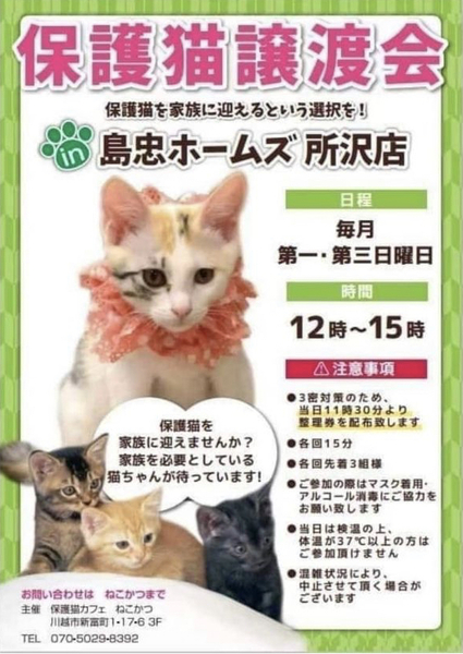 | イベント内容 | 保護猫カフェねこかつさん主催の保護猫譲渡会です? 初めて猫ちゃんをお迎えしたい方や先住猫ちゃんのお友達にゃんこをお探しの方はぜひ譲渡会へご参加ください☆*:.。. o(≧▽≦)o .。.:* 子猫から大人猫ちゃんまで多数参加していますので運命の赤い糸で繋がっている子に出会ってください♡ ※感染対策のため整理券の配布がございます。 島忠さんでは保護猫ちゃんたちのために常設のご寄付BOXもございますのでそちらもぜひよろしくお願い致します。 |