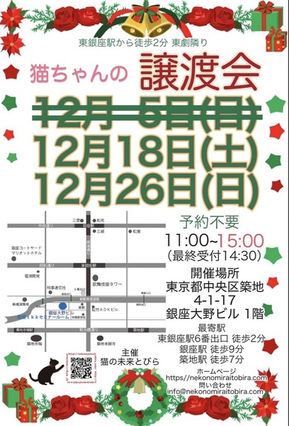 | イベント内容 | 東銀座で保護猫の譲渡会を開催しています「猫の未来とびら」です♪ 恵まれない環境にいる猫たちが未来へのとびらを開いて幸せなご縁に繋がる橋渡しをしていきます。 たくさんの猫ちゃんと保護主・スタッフ一同みなさまのご来場を心よりお待ちしています! 子猫ちゃん〜成猫ちゃんまで参加します♪ ※ご来場頂く方と私たち保護主、スタッフの安心と安全の為、感染リスクを限りなく低減させる為、私たちが出来うる対策をしてお待ちしております※ 【ご来場いただく皆様には下記についてお願い致します】 ★不織布マスクの着用をお願い致します。 (マスク着用のない方は入場出来ません) ★譲渡会場にお入り頂く前に検温・手洗いと手の消毒、検温をお願い致します。 ★ソーシャル・ディスタンス(人と人との間隔を開ける)をお願い致します。 ★熱のある方や体調の優れない方は譲渡会への来場を見合わせて頂けますよう、お願い致します。 ★来場者数によりましては人数制限もありますので長時間お待たせてする場合もございます。 予めご了承下さい。 コロナウイルス感染拡大防止の為、厳しいお願いで大変恐縮ですが何卒ご理解とご協力、ご了承をいただけますようお願い致します。 ★☆★★☆★★☆★★☆★★☆★★☆★★☆★★☆★★☆★ ★開催日時 2021年12月18日(土) 11:00~15:00 (最終受付 14:30) ★会場 東京都中央区築地4-1-17 銀座大野ビル 1階 (東劇となり) ★最寄駅 東銀座駅 6番出口 徒歩2分 銀座駅 徒歩9分 ・築地駅 徒歩7分 駐車場は当ビルの駐車場または近隣のコインパーキング等をご利用ください。 会場への直接のお問い合わせはご遠慮くださいませ。 ★☆★★☆★★☆★★☆★★☆★★☆★★☆★★☆★★☆★ コロナ禍のため、猫ちゃんとの触れあいはご遠慮頂いております。 里親様・猫ちゃんが双方、幸せな家族になれるよう保護主・スタッフがサポート致します。 ご不安な事はお気軽にご相談ください。 入場無料です。事前のご予約は不要です。 当日猫ちゃんの引き渡しはございません。 後日、保護主が里親様宅へお届けいたします。 ※参加予定猫ちゃんは、急な体調不良等で不参加になる場合もございます。 開催当日の朝、当会ブログにて不参加の最新情報を掲載致しますのでご確認をお願い申し上げます。 ◇譲渡に関してのお願い・基本条件 1.家族の一員として終生最期まで愛育下さい。 2.完全室内飼い・ペット可のお住まい(契約書を拝見致します) 3.脱走防止対策 4.避妊・去勢手術 5.里親様のご自宅へのお届け 6.譲渡誓約書への署名捺印・身分証明書の提示 7.医療費譲渡金のご負担 8.定期報告 9.トライアル期間有り ※保護主により譲渡条件は異なりますので会場で直接ご相談ください。 60才以上の方のみのご家庭、未成年の方、単身の方、同棲中の方、 小学生低学年以下のお子様のいる方、必要な脱走対策を施していただけない方は譲渡が出来かねますのでご了承ください。 仔猫の場合は主にお世話される方のご年齢は55歳までとさせて頂きます。 オーバーする方はご相談くださいませ。 小さな子猫の譲渡は体重が1kgになってからのお届けやお留守番の無い(少ない)ご家庭を希望いたします。 動物も病気になったり、年老いた場合には介護が必要になる場合がございますので、その時にきちんと必要な医療費を捻出出来る、経済力がある里親さまへの譲渡となります。 医療費譲渡金に関しましては詳しくはホームページの 【譲渡に関してのお願い】【譲渡の流れ】をご覧くださいませ。 ~主催 猫の未来とびら~ |