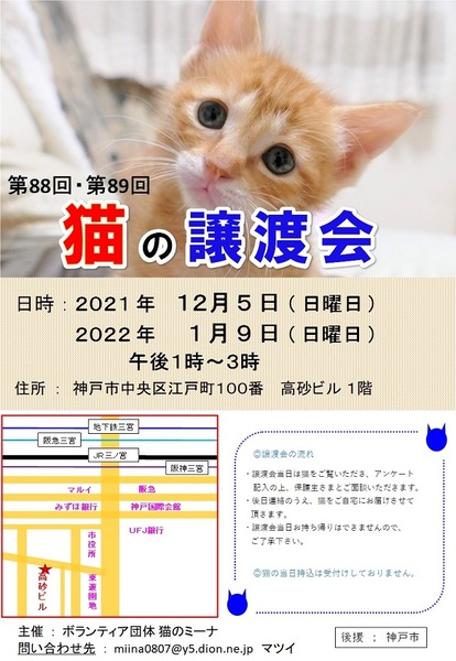 | イベント内容 | 保護された猫たちが参加して、新しいお家を求めて参加します(=^・^=) 猫は後日こちらからお届けをさせて頂き、お家の環境を見せて頂ければと思います。 猫は20年くらい生きる子もいますので、ご自身の年齢に合った猫さんとの出会いを探しに来てください。 ペット不可にお住まいの方はご遠慮ください! 仔猫の場合は、お留守番が長いお家には難しいですので、ご了承ください。 譲渡には条件が多数ありますので、ご理解くださいませ<m(__)m>。 まずはお試しで猫との相性を見てから、正式譲渡とtなります。 お越しの際は各路線の三宮駅からは徒歩10分くらい、車でお越しの場合は近隣のコインパーキングなどにお停めください。 当日、体調の悪い方、発熱がある方、このような方はご遠慮ください。 こちらでは、体温チェックや消毒をし、万全を期しております。 |