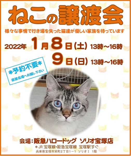 | イベント内容 | 宝塚市内で2日間連続開催します。 皆様のお越しをお待ちしています。 【日時】 2022年1月8日(土) ・9日(日) 13:00~16:00 【場所】 阪急ハロードッグ・ソリオ宝塚店内 阪急宝塚駅直結 ・ JR宝塚駅 徒歩2分 【予約不要】 直接会場へお越し下さい。 ****************** 年明け最初の譲渡会。2日間連続開催です。 1日目、2日目と一部の猫は入れ替わりでの参加です。 たくさんの可愛い猫たちが、皆様のご来場をお待ちしています。 会場は阪急ハロードッグ宝塚店内。阪急宝塚駅直結 ・ JR宝塚駅徒歩2分の場所にあります。 阪急百貨店を目指してお越し下さい。 お店にはキャットグッズも充実していますのでそちらもぜひご覧下さい。 【主催】 特定非営利活動法人 TNR宝塚 【後援】 宝塚市 【問合せ】 kaizaru7★yahoo.co.jp(★を@に変えて下さい) 詳しくはブログをご覧下さい。 https://ameblo.jp/takarazuka-tnr/ |