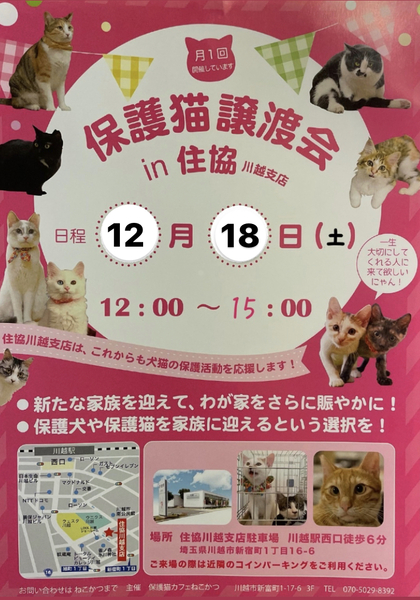 | イベント内容 | 保護猫カフェねこかつさん主催の保護猫譲渡会です☆*:. 株式会社住協川越支店さんの駐車場をお借りして開催致します♡ 保護猫をお迎えしたいとお考えの方や、可愛い猫ちゃんを見たいという方、可愛い可愛い保護っ子たちがぬくぬくしながら皆様のお越しをお待ちしております? ※屋外での開催となりますがマスクのご着用をお願い致します。 |