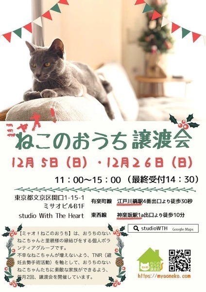 | イベント内容 | 参加する保護猫ちゃんについては、譲渡会一週間前からホームページにてご紹介しております。 https://myaoneko.com 事前予約はできません。 猫ちゃんをお世話することになるご家族皆様でお越しくださると嬉しいです。 譲渡会場でお会いしましょう♪ 【新型コロナウイルス対策について】 会場受付にて、以下の点をお願いする予定です。 ✿マスクの着用 ✿手洗いと消毒 ✿連絡先のご記入 御来場者多数の場合には入場制限を設けさせていただきます。 ※当日沢山のご来場者様がいらっしゃった場合、 整理券をお渡しする事がございます。 会場外で長時間お待たせする場合もございますが ご理解くださいますようお願い致します。 皆さまの長時間の在室を避ける為、 希望者様へは後日のご連絡とさせて頂きます。 ※ 感染防止対策時の特例となります。 ◇譲渡に関してのお願い 【ミャオ!ねこのおうち】では譲渡に際して、以下の要件をお願いしております。 ・完全室内飼いで終生愛育 ・脱走させないための対策 ・不妊去勢手術 ・譲渡誓約書の取り交わし ・医療費の一部ご負担 ※60才以上の方のみのご家庭、独身や、経済的に困難な世帯、 必要な脱走対策を施していただけない方には原則的に譲渡はご遠慮頂いております。 また、保護主により譲渡条件が異なる場合もございますので会場でご相談ください。 参加予定ねこちゃんは、急な体調不良などで不参加になる場合もございます。 【譲渡に関してのお願い】・【医療費の一部のご負担】・【譲渡までの流れ】など 詳しくは下記ホームページをご覧くださいますよう宜しくお願い致します。 ミャオ!ねこのおうち譲渡会 ホームページ https://myaoneko.com |