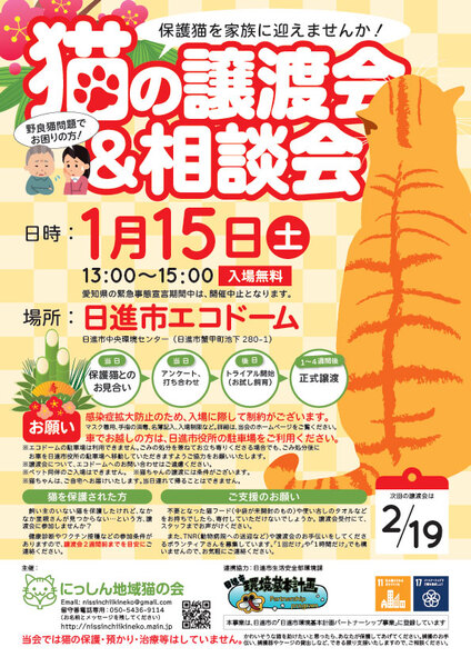 | イベント内容 | 1月15日(土)に「猫の譲渡会」を開催いたします。 猫少なめのミニ譲渡会&相談会です。 保護猫を迎えたい方はもちろん、ご近所との猫トラブルなどでお悩みの方もお気軽にお立ち寄りください!(^^)/ 緊急事態宣言中は開催中止となります。 また、感染症拡大防止のため、入場に際して制約がございますので、ご理解・ご協力をお願いいたします。詳細は、ホームページにて随時更新いたします。 【日時】2022年1月15日(土)13:00〜15:00 【会場】日進市エコドーム(中央環境センター) ※入場無料・予約不要です。 ※ペット同伴のご入場はできませんので、予めご了承ください。 ※暖かい服装でお越しください。感染症拡大防止対策として、室外でお待ちいただく場合や室内換気のため暖房が効きにくいことがございます。 ※猫ちゃんの譲渡には条件がございます。詳細はホームページをご参照ください。 ※車でお越しの方は、日進市役所の駐車場をご利用ください(徒歩1分)。エコドームの駐車場は、ごみを持参される方専用のため、利用できません。ごみの処分を兼ねてお立ち寄りくださる場合でも、誠にお手数ですが、ごみ処分後にお車を日進市役所の駐車場へ移動していただきますよう、どうぞご協力をお願いいたします。 【主催】にっしん地域猫の会 【ホームページ】http://nissinchiikineko.main.jp |