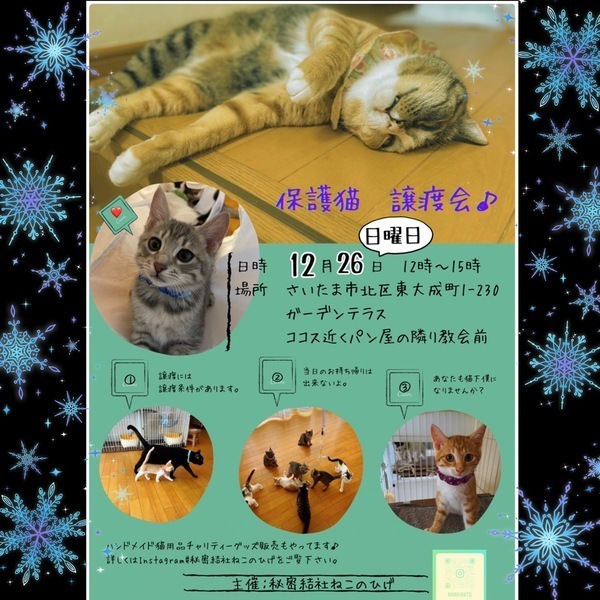 | イベント内容 | 【秘密結社ねこのひげ/保護猫譲渡会】 12/26(日) 12:00~15:00 さいたま市北区東大成町1-230 ガーデンテラス内にて開催します。 家族にするなら保護猫だべ♪♪ 新年に新しい家族を迎えたい方は 是非会いにいらしてください♡ 新型コロナ対策として 受付名簿のご記入、消毒 マスク着用などのご協力をお願い致します。 物販の方も屋外スペースにて こじんまり置かせて頂きますので ご近所の方はふらりと是非 お立ち寄りくださいませ。 ご不明な点がございましたら インスタグラム @秘密結社ねこのひげ の DMまでお問い合わせ下さい。 |