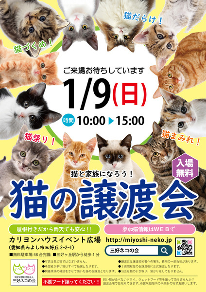 | イベント内容 | 新春初猫譲渡会!ちびでか11匹!! 新顔は緊張緊張の譲渡会デビューです! 参加猫がもうちょっと増えるかも? ▼寅年じゃなくて猫年にしましょう! 1月9日(日)10時~15時 愛知県みよし市三好丘2-2-1 三好ヶ丘カリヨンハウスイベント広場(暖房完備) http://miyoshineko.sblo.jp/article/189245991.html ※来場者多数の場合は入場制限を行う場合があります。 ●譲渡が決まると猫トイレ、トイレ砂5L×2袋をもれなく進呈。 LIONさんから素敵なプレゼントが届きます! http://miyoshineko.sblo.jp/article/188311208.html NPO法人三好ネコの会 http://miyoshi-neko.jp [フードの寄付] http://miyoshi-neko.jp/fund |