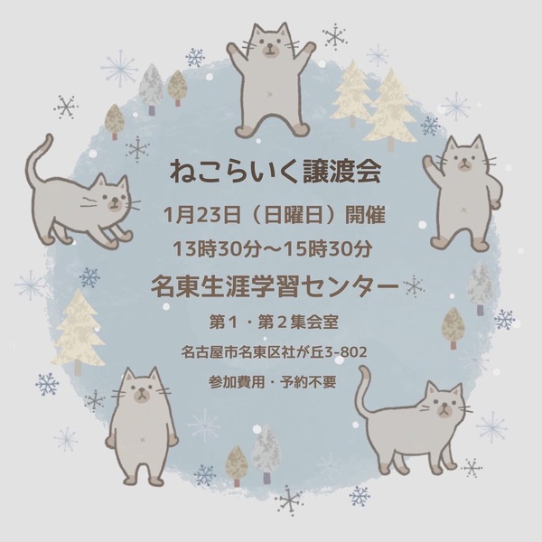 | イベント内容 | 「猫の譲渡会」 日にち:2022年1月23日(日) 時間 :午後1時30分~3時30分 会場 :名東生涯学習センター 名古屋市名東区社が丘3-802 ?予約・入場料不要です *駐車場有(300円/日) 満車の場合は猪高緑地公園駐車場(無料)ご利用になれます 近隣にコインパーキングがあります 主催:ねこらいくnenet ?https://nekonetwork.com/ 募集猫中の猫は ?https://nekolike.amebaownd.com/ ―------- 上記ブログで紹介しています 猫の急な体調変化により参加できない 場合もあります。 ご了承いただきますようお願いします。 実際に猫を見てから考えたい 飼育の仕方について質問したい・・・など すぐに決められない方でも結構ですぜひ、譲渡会におこしください 〇室内飼い、家族全員の同意、治療費の負担などお願いごとがあります 〇1~2週間のお試し飼育期間があります 〇当日、猫を連れて帰ることはできません ??♂️感染症対策を実施しています ・会場入出時の手の消毒、検温にご協力ください ・常時、窓を開け換気をしています ・スタッフはマスクを着用し、ご入場の方にもマ スクの着用をお願いしています ・室内への入場は一定の人数とさせていただきます |