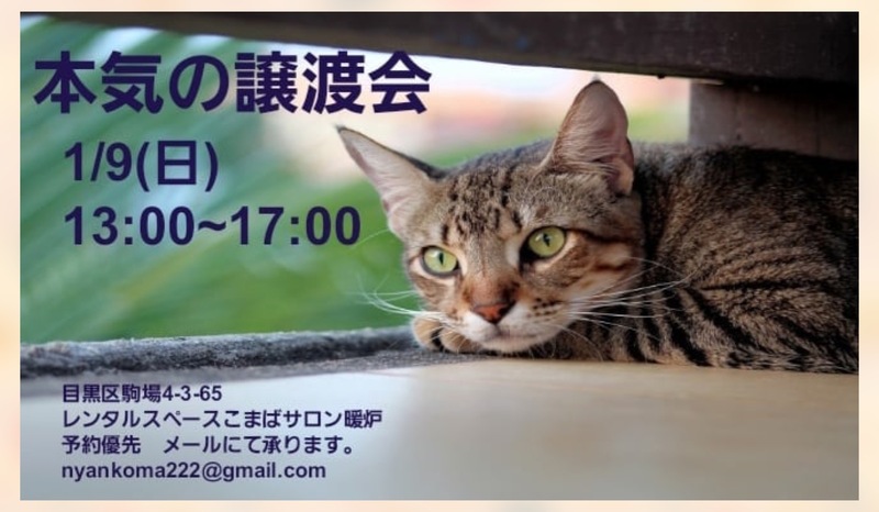 | イベント内容 | 2022/1/9(日) 13:00~17:00 東京都目黒区駒場4-3-65 こまばサロン暖炉 にて保護猫譲渡会を開催します。 事前予約の際にお声のかからなかった猫は参加しない可能性もありますので、気になる子がいたらご予約の際にお伝えください。 複数の猫でも、子猫、成猫、キジトラ子猫などざっくりした希望でもかまいません。 予約優先制となります。 60分毎入れ替え制 各回10名まで 60分で猫ちゃんを選んで、お申し込みの方はお申し込みのお部屋へ移動してください。 お申し込みのない場合はそのままご退出ください。 ご予約は nyankoma222@gmail.com に、 以下の点を添えてお申し出ください。 ・名前(ニックネーム可) ・希望時間帯(①13:00~②14:00~③15:00~④16:00~) ・人数 ・会いたい猫がいれば猫の名前など トラブル防止のため、電話ではなくメールでのご予約をお願いします。 現時点での予約状況はFacebookのイベントページで順次更新されますのでご確認ください。 様々な理由で保護された猫達の里親さんを探す譲渡会です。 個人ボランティアが多く参加しますので、 保護主によって応募条件や譲渡費用が異なります。 新型コロナウイルス感染対策としては、開催前は次亜塩素酸水と高温スチームモップによる床などの除菌・清掃を行います。 開催中は定期的な換気を行い、手指の消毒スプレーなど複数設置します。 会場へはマスクの装着必須です。 入り口で検温と消毒をします。 当日咳および発熱の症状のある方はご来場をご遠慮ください。 だっこやお触りなどのふれあいも出来ません。 猫が見たいだけ、飼いたいけどペット不可住宅に住んでいる、3年後に飼うつもり、家族が反対しているなど、すぐに猫を飼えない方のご参加はご遠慮下さい。 本気で猫を飼いたい方に参加して頂きたい譲渡会です。 飼いたいけれど今回はビビっと来なかったという方に無理矢理猫を勧めたりはしないのでご安心ください。 当日の猫のお渡しは出来ません。 カンパや寄付などは玄関前でのお引き取りになります。 -------------------- [主催] 保護猫譲渡会カフェ こまばサロン暖炉 [FBページ] https://www.facebook.com/nyankomaba [FBイベント]https://www.facebook.com/nyankomaba/events [Instagram]https://www.instagram.com/komaba.neko/ ※必ず主催者様のFBページをご確認ください。 -------------------- |