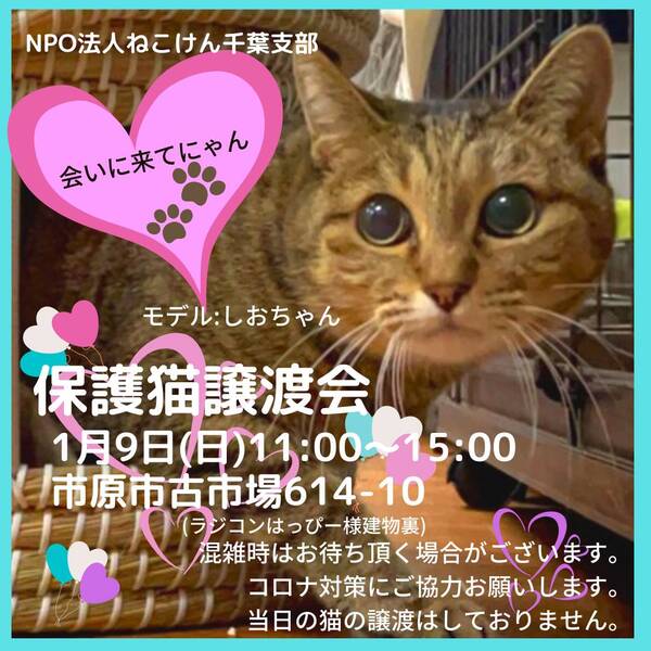 | イベント内容 | 春から夏に生まれ、保護された沢山の子猫達。 元気にスクスク成長し、譲渡会に参加できる準備が整いました。 通常スタイルの譲渡会と致しますが、コロナウイルス対策として ・会場内ではマスクのご着用と入退室の際は消毒をお願い致します。 ・ご予約無しでお越しいただけますが、混雑時は整理券を配らせていただきます。 ご協力の程よろしくお願い致します。 成猫は指名制のお見合いとさせていただく子もおりますので、 『◯◯ちゃんと、お見合い希望』とご指名の事前申し込みをお願い致します。 ねこけん千葉支部のブログ内にありますお問い合わせフォームより、 ⚫︎お名前 ⚫︎ご住所(市区町村までで大丈夫です) ⚫︎お見合いご指名猫の名前を、お知らせください。 ※締め切りは譲渡会前日1月8日(土)18時までとなっております。 ねこけん千葉支部ブログ→ https://ameblo.jp/nekoken-chiba/ また、譲渡会会場では、千葉県内にお住いの預かりボランティアさん及びお世話ボランティアさんを募集しています。 ご希望の方は、大変お手数をおかけしますが、譲渡会までお越しください。 ※ご都合がつかない場合は、お問い合わせ先までご相談ください。 [日時] 1月9日(日)11:00~15:00 [会場] 千葉県市原市古市場614-10 ※屋内での開催となり雨天決行です。 ※抱っこもOK! ※猫ちゃんの負担も考え、ご来場は時間内にお願い致します。 ※特にご予約などは必要ございませんのでご家族皆様でぜひお越し下さい。 ※駐車場あり。 [交通] 交通機関を利用してお越しの方 JR内房線 浜野駅より徒歩13分 浜野駅は、東京駅から京葉線→内房線でおよそ50分の距離!! お車でお越しの方 京葉道路蘇我インターより車で10分 ※駐車場はラジコンショップハッピー様裏手にございます駐車場をご利用ください [譲渡ご希望の方へのお願い] 誠に恐れ入りますが下記に当てはまります方への譲渡は不可となりますので予めご了承下さい。 ①学生さん、未成年の方、安定収入のない方 ②ペットを飼う事を許されていない住宅にお住まいの方 ③身体的、精神的疾病で治療中の方 ※60歳以上の方は別途条件がございますのでご相談下さい。 [譲渡の流れ] お申込み→審査→後日お届け→トライアル→正式譲渡 ※当日のお連れ帰りは出来ませんので予めご了承ください。 ※仮譲渡時にご希望の猫ちゃんにかかった医療費(血液検査・ワクチン・駆虫・不妊去勢手術等)をご負担願います。 しかし、正式譲渡に至らなかった場合は医療費を全額返済致します。 [主催] 動物愛護団体 NPO法人ねこけん 千葉支部 [ブログ] https://ameblo.jp/nekoken-chiba/ [参加動物] 成猫・子猫(ねこけん保護猫以外の猫ちゃんも参加予定です) [お問い合わせ] ご不明な点、ご質問等ございましたら下記までお問い合わせください。 chiba.info@nekoken.jp |