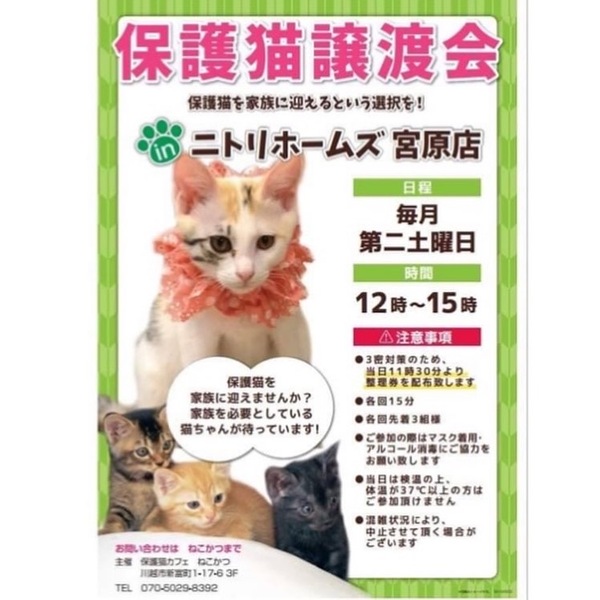 | イベント内容 | 保護猫カフェねこかつさん主催の保護猫譲渡会です? 子猫も成猫もみんなずっとのおうちを探しています♡ 今年こそは保護猫を家族に迎えたいとお考えの方はぜひ譲渡会にお越しください☆*:.。 感染症対策のため、以下へのご協力をお願い致します。 ✳︎当日は11時半より整理券を配布致します。 ✳︎各回15分 ✳︎各回先着3名組様 ✳︎ご参加の際はマスク着用、アルコール消毒のご協力をお願い致します。 ✳︎当日の検温の上、体温が37度以上の方はご参加いただけません。 |