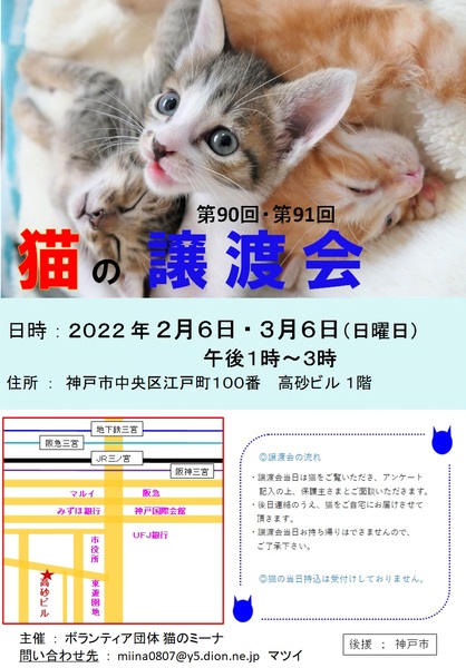 | イベント内容 | 保護された猫たちが参加して、新しいお家を求めて参加します(=^・^=) 猫は後日こちらからお届けをさせて頂き、お家の環境を見せて頂ければと思います。 猫は20年くらい生きる子もいますので、ご自身の年齢に合った猫さんとの出会いを探しに来てください。 ペット不可にお住まいの方はご遠慮ください! 譲渡には条件が多数ありますので、ご理解くださいませ<m(__)m>。 まずはお試しで猫との相性を見てから、正式譲渡とtなります。 この時期ですので、参加希望の方はご予約をお願いします。 『猫のミーナ』のホームページ【お問い合わせ】からお申し込みください。 お越しの際は各路線の三宮駅からは徒歩10分くらい、車でお越しの場合は近隣のコインパーキングなどにお停めください。 当日、体調の悪い方、発熱がある方、このような方はご遠慮ください。 こちらでは、体温チェックや消毒をし、万全を期しております。 |