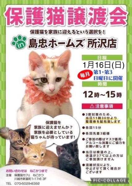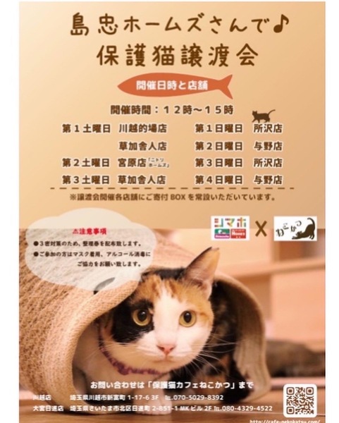 | イベント内容 | 保護猫カフェねこかつさん主催の保護猫譲渡会です? ねこかつさんの猫ちゃん他、個人ボランティアさんの猫ちゃんが多数参加します♡ 保護猫ちゃんをお迎えしたい方はぜひお越しください☆*:. ⭐︎当日の11時半から整理券を配布致します。 ⭐︎感染症対策のためご来場の際はマスクの着用、アルコール消毒をお願い致します。 ⭐︎当日の検温で37度以上の熱がある方はご参加できません。 |