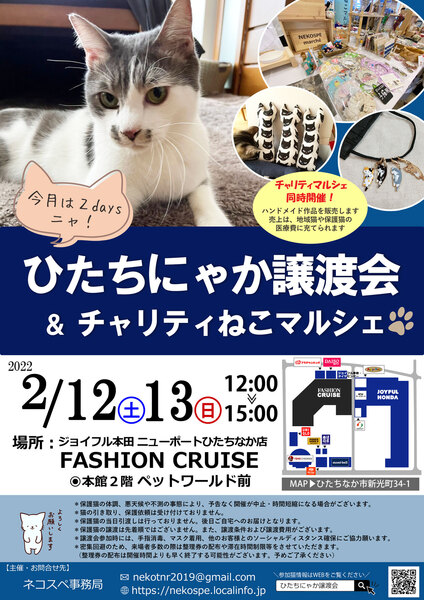 | イベント内容 | ジョイフル本田ニューポートひたちなか店での保護猫譲渡会です。 今月は第2土曜と日曜日の2連続開催。 ●混雑を避けるため、当日11時30分より整理券を配布し、 30分6組ずつの入れ替え制とします。 整理券が無くなった時点で配布終了となります。予めご了承ください。 ●会場のジョイフル本田ニューポートひたちなか店は、 ホームセンター棟とショッピングモール棟にわかれており、 ショッピングモール棟「FASHION CRUISE」2階のペットワールド前で開催します。 子猫から大人猫まで約20匹の猫が参加予定です。 参加猫は1週間前くらいにホームページに掲載します。 https://nekospe.localinfo.jp/pages/3615949/page_202002262017 ●チャリティねこマルシェも同時開催。 支援者さんから寄付していただいたハンドメイド作品を販売します。 売上は、保護猫やノラ猫の医療費に充てられます。 お買い物で「ねこ助け」 どうぞよろしくお願いします。 *** 「ひたちにゃか譲渡会」 ・日時:2月12日(土)・13日(日) 12時〜15時 ・場所:ジョイフル本田ニューポートひたちなか店 FASHION CRUISE 2階 ペットワールド前(ひたちなか市新光町34-1) ・予約不要・入場無料 ※当日、整理券配布あり ・駐車場あり(無料4,320台) *ペットを連れての譲渡会来場はお断りしています。 *猫の引き取り、保護依頼は受け付けておりません。 *保護猫の体調、悪天候や不測の事態により、予告なく開催が中止・時間短縮になる場合がございます。 *保護猫の当日引渡しは行っておりません。後日ご自宅へのお届けとなります。 *保護猫の譲渡は先着順ではございません。また、譲渡条件および譲渡費用がございます。 *譲渡会参加時には、手指消毒、マスク着用、他のお客様とのソーシャルディスタンス確保にご協力願います。 *密集回避のため、来場者多数の際は整理券の配布や滞在時間制限等をさせていただきます。 (整理券の配布は開催時間よりも早く終了する可能性がございます。予めご了承ください) ◉ネコスペ事務局 ネコスペ事務局は、個人で活動するボランティアさんの後方支援部隊です。 保護猫・保護犬の譲渡会やイベントを企画・運営しています。 https://nekospe.localinfo.jp |