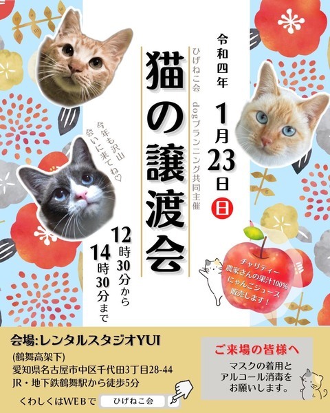| イベント内容 | ひげねこ会・ドッグプランニング 合同で譲渡会を開催します。 3ヶ月くらいの子猫から大人猫達が参加します。 ☆チャリティ☆ にゃんごジュース販売もあります。 りんご農園さんからの100%果汁ジュースです ドッグプランニング☆インスタグラム https://www.instagram.com/yuko9124/ ひげねこ会HP https://sabuntama.wixsite.com/higenecokai ☆sabuntama インスタグラム https://www.instagram.com/sabuntama/ ☆会場 愛知県 名古屋市中区千代田三丁目28-44 レンタルスタジオYUI(鶴舞高架下) ☆12:30~14:30 JR・地下鉄鶴舞駅から徒歩5分 ☆駐車場 鶴舞交差点~南のJR中央線ガード西側道路は休日駐車禁止解除になっています。 (休日駐禁解除区間に空きが無い場合は、コインパーキングをご利用ください。) 譲渡会についてのお願いです ※入場の際マスク着用・消毒をお願いします。 蜜を避けるため、入場制限をお願いする場合があります。 ※面会時間は15以内でお願いします。 ご不便をおかけしますが、ご理解ご協力よろしくお願いします。 |