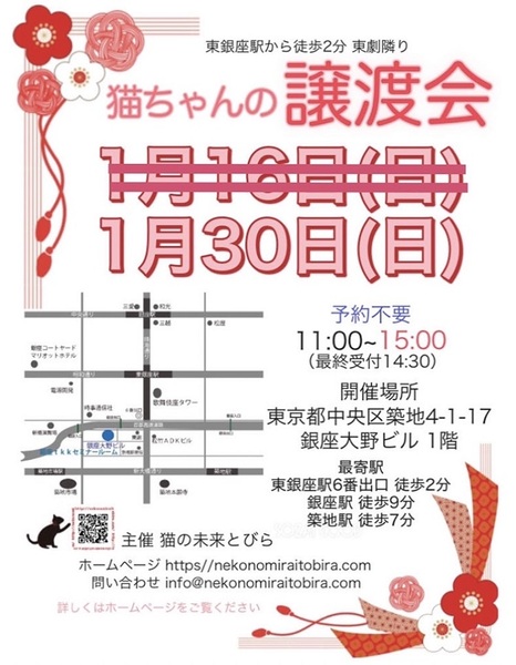 | イベント内容 | 東銀座で保護猫の譲渡会を開催しています「猫の未来とびら」です♪ 恵まれない環境にいる猫たちが未来へのとびらを開いて幸せなご縁に繋がる橋渡しをしていきます。 たくさんの猫ちゃんと保護主・スタッフ一同みなさまのご来場を心よりお待ちしています! 子猫ちゃん〜成猫ちゃんまで参加します♪ ※ご来場頂く方と私たち保護主、スタッフの安心と安全の為、感染リスクを限りなく低減させる為、私たちが出来うる対策をしてお待ちしております※ 【ご来場いただく皆様には下記についてお願い致します】 ★不織布マスクの着用をお願い致します。 (マスク着用のない方は入場出来ません) ★譲渡会場にお入り頂く前に検温・手洗いと手の消毒、検温をお願い致します。 ★ソーシャル・ディスタンス(人と人との間隔を開ける)をお願い致します。 ★熱のある方や体調の優れない方は譲渡会への来場を見合わせて頂けますよう、お願い致します。 ★来場者数によりましては人数制限もありますので長時間お待たせてする場合もございます。 予めご了承下さい。 コロナウイルス感染拡大防止の為、厳しいお願いで大変恐縮ですが何卒ご理解とご協力、ご了承をいただけますようお願い致します。 ★☆★★☆★★☆★★☆★★☆★★☆★★☆★★☆★★☆★ ★開催日時 2022年1月30日(日) 11:00~15:00 (最終受付 14:30) ★会場 東京都中央区築地4-1-17 銀座大野ビル 1階 (東劇となり) ★最寄駅 東銀座駅 6番出口 徒歩2分 銀座駅 徒歩9分 ・築地駅 徒歩7分 駐車場は当ビルの駐車場または近隣のコインパーキング等をご利用ください。 会場への直接のお問い合わせはご遠慮くださいませ。 ★☆★★☆★★☆★★☆★★☆★★☆★★☆★★☆★★☆★ コロナ禍のため、猫ちゃんとの触れあいはご遠慮頂いております。 里親様・猫ちゃんが双方、幸せな家族になれるよう保護主・スタッフがサポート致します。 ご不安な事はお気軽にご相談ください。 入場無料です。事前のご予約は不要です。 当日猫ちゃんの引き渡しはございません。 後日、保護主が里親様宅へお届けいたします。 ※参加予定猫ちゃんは、急な体調不良等で不参加になる場合もございます。 開催当日の朝、当会ブログにて不参加の最新情報を掲載致しますのでご確認をお願い申し上げます。 ◇譲渡に関してのお願い・基本条件 1.家族の一員として終生最期まで愛育下さい。 2.完全室内飼い・ペット可のお住まい(契約書を拝見致します) 3.脱走防止対策 4.避妊・去勢手術 5.里親様のご自宅へのお届け 6.譲渡誓約書への署名捺印・身分証明書の提示 7.医療費譲渡金のご負担 8.定期報告 9.トライアル期間有り ※保護主により譲渡条件は異なりますので会場で直接ご相談ください。 60才以上の方のみのご家庭、未成年の方、単身の方、同棲中の方、 小学生低学年以下のお子様のいる方、必要な脱走対策を施していただけない方は譲渡が出来かねますのでご了承ください。 仔猫の場合は主にお世話される方のご年齢は55歳までとさせて頂きます。 オーバーする方はご相談くださいませ。 小さな子猫の譲渡は体重が1kgになってからのお届けやお留守番の無い(少ない)ご家庭を希望いたします。 動物も病気になったり、年老いた場合には介護が必要になる場合がございますので、その時にきちんと必要な医療費を捻出出来る、経済力がある里親さまへの譲渡となります。 医療費譲渡金に関しましては詳しくはホームページの 【譲渡に関してのお願い】【譲渡の流れ】をご覧くださいませ。 ~主催 猫の未来とびら~ |