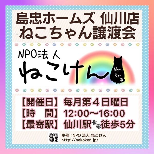 | イベント内容 | ペットとしてではなく、生涯家族として猫を迎えて下さる方への譲渡となります。 原則『譲渡会』にて正式なお申込みを承っております。 譲渡会には家族を待っている猫さん達がたくさん参加します♪ ▽▲ねこけん定期譲渡会▲▽ ★毎月第4日曜日は島忠ホームズ仙川店にて開催★ [時間] 12:00〜16:00 [会場] 島忠ホームズ仙川店 〒182-0003 東京都調布市若葉町2-1-7 https://www.shimachu.co.jp/gmshop/tokyo/313.html [交通] ・京王線「仙川駅」より徒歩約5分 ・駐車場完備 ※当日11:30より整理券を配布します。 (各回15分、各回先着3組様) ※屋内での開催となり雨天決行です。 ※猫ちゃんたちとのふれあいはできません。 ※事前のご予約は必要ございません。ご家族皆様でお越し下さい。 ◆必ずお守り頂く事◆ ①終生飼養 ②完全室内飼養 ③年1回のご報告 ④ペット飼育可能な物件にお住まいであること ただし、以下の該当の方は、譲渡出来ない場合がございます。 ※学生、安定的な収入のない方 ※60歳以上の方は、成猫さんを家族に迎え入れることが出来ます。 里親様のご年齢に応じた成猫の譲渡となりますのでご相談ください。 ◆譲渡費用について◆ 不妊去勢手術・医療費の一部負担をお願いしております。 お届けエリアによっては往復高速料金(実費)を別途ご負担いただく場合がございます。 なお、交通費に関しましては正式譲渡に至らない場合であってもご返却できませんので予めご了承下さい。 ・ご希望の猫さんと家族になるまでの流れ ・譲渡時にかかる一部ご負担金などの詳細 ・譲渡契約書のサンプル等 下記URLに掲載しておりますのでご確認ください。 https://nekoken.jp/jotokai/joto-nagare/ https://nekoken.jp/jotokai/joutokibou/ ◆引き渡し方法◆ 1週間程度のトライアルの後、正式譲渡となります。 必ずご自宅までお届けします。 ◆お届け可能エリアについて◆ 応募可能エリア内であっても、遠方の場合アフターフォローの関係上お断りさせていただくことがございます。 ご心配な際は、前もって市区町村名や最寄り駅等をメールにてお問い合わせいただけますと幸いです。 お手数をおかけいたしますが、何卒ご了承くださいますようお願いいします。 ※譲渡会日程がご予定と合わず個別お見合いご希望の方は、各募集サイトからのご応募 もしくは下記連絡先までお問い合わせください。 ※猫さんの性格や体質により譲渡会に参加することが困難な子もいます。 気になる猫さんの譲渡会への参加情報などは、個別にお問い合わせください。 [連絡先] ご質問等ございましたらお気軽にお問い合わせください。 NPO法人ねこけん東京本部 https://nekoken.jp/inquiry/ nekoken@cat.email.ne.jp [ホームページ] https://nekoken.jp [Instagram] https://www.instagram.com/nekoken2222/ [ブログ・ボラ日記・YouTubeなど] https://linktr.ee/nekoken フォロー・チャンネル登録よろしくお願いします! |