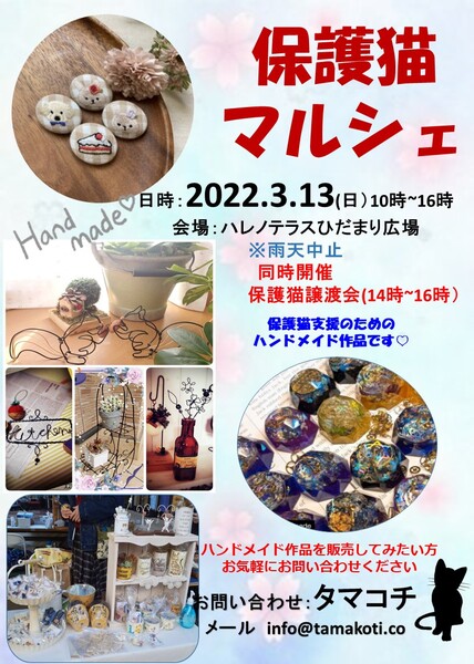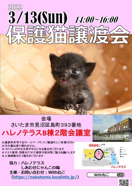 | イベント内容 | 場所 埼玉県さいたま市見沼区島町393番地 ハレノテラス B棟2F会議室 ハレノテラスHP http://hare-terra.com/ ※新型コロナウィルス感染防止のため厳守していただきたい事項がございます マスク着用必須 手指の消毒 入場時アンケート記入(入場制限を行う場合がございます) ※熱のある方の入場はお断りしています ☆当日猫を連れ帰ることはできません ☆譲渡条件あります。譲渡費用発生します。 ☆見学のみの入場はお断りしています ☆猫の引き取りはお断りいたします Withねこ https://nekotomo.localinfo.jp/ 保護猫タマコチ:https://cafe.tamakoti.co/ しっぽのしらべ:http://sipponosirabe.com/ 他、個人で活動されている保護猫ボランティアさんが多数参加します |