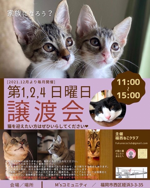 | イベント内容 | 福西ねこクラブさん主催 要予約! お問い合わせは、インスタのdmもしくはメールnanami.inatsu@gmail.comからお願い致します! 保護猫の譲渡会に 保護猫ボラいなつの保護っ子も参加します! |