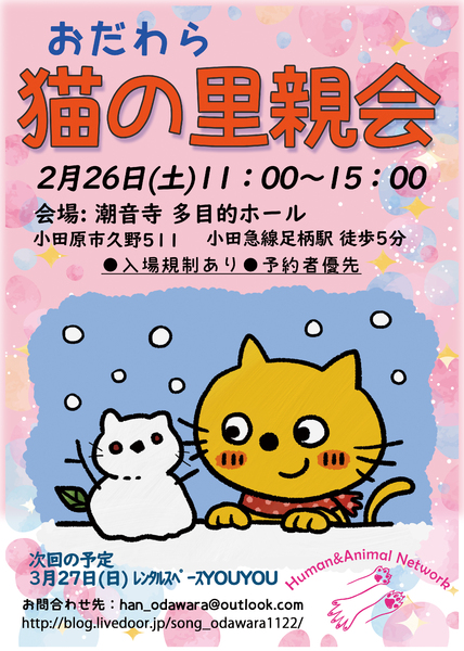 | イベント内容 | 日時:2022年2月26日(土)11:00~15:00 会場:潮音寺 多目的ホール 神奈川県小田原市久野511 小田急線足柄駅より徒歩6分 駐車場有(無料) ※詳細はブログをご覧ください http://blog.livedoor.jp/song_odawara1122/archives/58988313.html ※コロナ感染予防のマナーにご協力ください※ ◆来場人数に制限をしますのでご理解ください ◆なるべく多くの方がご来場できるよう少人数でお越しください(1家族2名が基本) ◆事前予約の方が優先入場となります。 下記の「事前予約の方法」をお読みください ◆1家族の割り当ては最大1時間です(お見合い30分、面談30分) ◆次のご来場者のために 割り当ての1時間が経ったら速やかにご退場ください ◆受付近辺に人が溜りやすいため、ご予約の時間までは車などで待機してください 【交通案内】 新宿方面から 小田急線足柄駅 横浜方面から JR東海道線:小田原駅 → 小田急線:足柄駅 ※注意※ ナビ検索では 小田原市久野507(潤生園やすらぎの家足柄)で 検索してください。 小田原市久野511 で検索すると迷子になります! □■□事前予約の方法■□■ 事前予約はメールにて受付けております メールアドレス:han_odawara@outlook.com ①ご応募の前に里親さんになるための条件を確認してください。 ②ご応募の際は以下6点を必ずご明記ください。 ●ご氏名 ●電話番号 ●最寄り駅 ●家族構成(年齢含む) ●先住ペットの有無 ●お見合いを希望する猫の名前 ③後日メール受付担当より当日の面談時間についてご連絡をいたします。 □■□里親さんになるための条件■□■ 1.終生愛情をもって飼育すること 2.完全室内飼い必須 3.ペット飼育可物件であること 4.脱走防止&名札の装着を徹底できること 5.猫を迎える事に家族全員の同意があること 6.譲渡後の定期報告ができること 7.ご家族に猫アレルギーの方がいないこと 8.単身者のご応募は保証人(非常時に飼育対応をしてくれる人)が居ること 9.ワクチン接種と傷病時の適切な治療ができること 10.万が一 猫が脱走した場合は適切な対応ができること 11.医療費と譲渡時の交通費を負担して頂けること 12.ペットを飼育できる十分な収入と時間があること 13.身分証明を提示できること 14.自宅への訪問が可能であること 15.譲渡誓約書の内容を十分理解し、譲渡後も誓約内容を継続的に守って頂けること 16.譲渡が決定した場合、譲受者一部負担金にご協力頂けること |