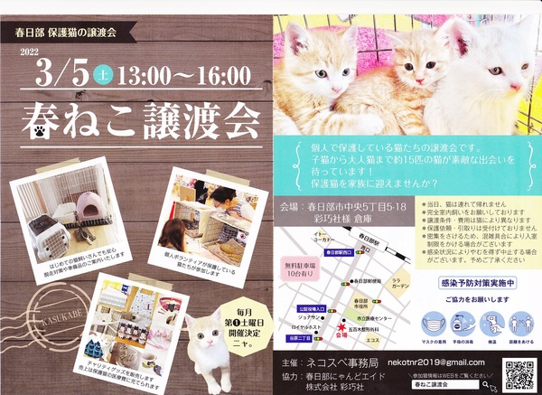 | イベント内容 | 春日部市で保護猫譲渡会を毎月第1土曜日に定期開催します。 春日部周辺でTNR活動をしている個人ボランティアが中心の譲渡会です。 手術できない子猫、虐待地域の野良猫や捨て猫、疾病猫など、 どうしても保護せざるを得ない子を保護し医療をかけて譲渡しています。 行き場のない猫たちの家族になっていただけませんか? 子猫から大人猫まで15匹くらいが参加します。 ぜひ良いご縁を結びにきてください。 参加猫情報は開催1週間前くらいにホームページに掲載いたします。 https://nekospe.localinfo.jp/pages/3406877/page_201911261811 春ねこ譲渡会 日時:2022年3月6日(土)13:00~15:00 場所:彩巧社さま倉庫(春日部市中央5-5-18) ・予約不要・入場無料 ・無料駐車場あり(10台程度) 主催:ネコスペ事務局 協力:春日部にゃんどエイド/有限会社彩巧社 |