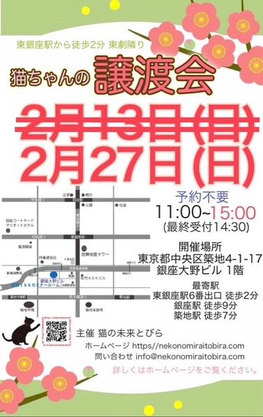 | イベント内容 | 東銀座で保護猫の譲渡会を開催しています「猫の未来とびら」です♪ 恵まれない環境にいる猫たちが未来へのとびらを開いて幸せなご縁に繋がる橋渡しをしていきます。 たくさんの猫ちゃんと保護主・スタッフ一同みなさまのご来場を心よりお待ちしています! 子猫ちゃん〜成猫ちゃんまで参加します♪ ※ご来場頂く方と私たち保護主、スタッフの安心と安全の為、感染リスクを限りなく低減させる為、私たちが出来うる対策をしてお待ちしております※ 【ご来場いただく皆様には下記についてお願い致します】 ★不織布マスクの着用をお願い致します。 (マスク着用のない方は入場出来ません) ★譲渡会場にお入り頂く前に検温・手洗いと手の消毒、検温をお願い致します。 ★ソーシャル・ディスタンス(人と人との間隔を開ける)をお願い致します。 ★熱のある方や体調の優れない方は譲渡会への来場を見合わせて頂けますよう、お願い致します。 ★来場者数によりましては人数制限もありますので長時間お待たせてする場合もございます。 予めご了承下さい。 コロナウイルス感染拡大防止の為、厳しいお願いで大変恐縮ですが何卒ご理解とご協力、ご了承をいただけますようお願い致します。 ★☆★★☆★★☆★★☆★★☆★★☆★★☆★★☆★★☆★ ★開催日時 2022年2月27日(日) 11:00~15:00 (最終受付 14:30) ★会場 東京都中央区築地4-1-17 銀座大野ビル 1階 (東劇となり) ★最寄駅 東銀座駅 6番出口 徒歩2分 銀座駅 徒歩9分 ・築地駅 徒歩7分 駐車場は当ビルの駐車場または近隣のコインパーキング等をご利用ください。 会場への直接のお問い合わせはご遠慮くださいませ。 ★☆★★☆★★☆★★☆★★☆★★☆★★☆★★☆★★☆★ コロナ禍のため、猫ちゃんとの触れあいはご遠慮頂いております。 里親様・猫ちゃんが双方、幸せな家族になれるよう保護主・スタッフがサポート致します。 ご不安な事はお気軽にご相談ください。 入場無料です。事前のご予約は不要です。 当日猫ちゃんの引き渡しはございません。 後日、保護主が里親様宅へお届けいたします。 ※参加予定猫ちゃんは、急な体調不良等で不参加になる場合もございます。 開催当日の朝、当会ブログにて不参加の最新情報を掲載致しますのでご確認をお願い申し上げます。 ◇譲渡に関してのお願い・基本条件 1.家族の一員として終生最期まで愛育下さい。 2.完全室内飼い・ペット可のお住まい(契約書を拝見致します) 3.脱走防止対策 4.避妊・去勢手術 5.里親様のご自宅へのお届け 6.譲渡誓約書への署名捺印・身分証明書の提示 7.医療費譲渡金のご負担 8.定期報告 9.トライアル期間有り ※保護主により譲渡条件は異なりますので会場で直接ご相談ください。 60才以上の方のみのご家庭、未成年の方、単身の方、同棲中の方、 小学生低学年以下のお子様のいる方、必要な脱走対策を施していただけない方は譲渡が出来かねますのでご了承ください。 仔猫の場合は主にお世話される方のご年齢は55歳までとさせて頂きます。 オーバーする方はご相談くださいませ。 小さな子猫の譲渡は体重が1kgになってからのお届けやお留守番の無い(少ない)ご家庭を希望いたします。 動物も病気になったり、年老いた場合には介護が必要になる場合がございますので、その時にきちんと必要な医療費を捻出出来る、経済力がある里親さまへの譲渡となります。 医療費譲渡金に関しましては詳しくはホームページの 【譲渡に関してのお願い】【譲渡の流れ】をご覧くださいませ。 ~主催 猫の未来とびら~ |