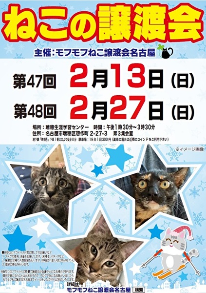 | イベント内容 | モフモフねこ譲渡会名古屋 猫たちの幸せなお家探しのために譲渡会を開催しております。 個人ボランティアの集まりです。 自分たちの出来ることから頑張っております! 一匹でも幸せになれる猫が増えますように 場所 瑞穂生涯学習センター 第3集会室 住所 名古屋市瑞穂区惣作町2-27-3 時間 13時30分~15時30分 交通機関等 地下鉄「妙音通」下車1番出口より徒歩8分 駐車場19台(満車の場合は近隣コインPをご利用ください) 参加猫の情報は下記モフモフねこ譲渡会名古屋ブログにてご確認ください。 https://mofumofuneko4.fc2.net/ 新型コロナウイルス対策として ・会場は換気を定期的に行います。 ・密を避けるため、入場制限をさせていただきます。 ・入口にて手指の消毒、検温をお願いいたします。 ・ご来場の際はマスク着用をお願いいたします。 ・咳・発熱・倦怠感等の体調のすぐれない方はご来場を控えていただきますよう、お願いいたします。 ・新型コロナウイルスの影響により急遽中止になる場合もありますので、モフモフねこ譲渡会名古屋ブログにてご確認の上、ご来場ください。 【譲渡会について】 ・譲渡会は入場無料、予約不要です。お気軽にご参加ください。 ・会場へのお問い合わせはご遠慮ください。 ご質問は下記メールアドレスへお願いいたします。 mofumofuneko4☆gmail.com ☆を@に変更してお問い合わせください。 ・猫の引き取りはしておりません。 ・譲渡会当日に猫をお渡しすることはありません。 ・保護主によって譲渡条件が違う場合があります。 ・参加予定でも譲渡会前にトライアルになる場合があります。 ご希望の猫がいましたらまずはお問い合わせをお願いいたします。 【参加猫について】 ・ノミ駆除、駆虫、トイレ躾、ワクチン3種接種済。 ・年齢や健康状態に応じて、避妊手術を行っております。 ・参加予定で紹介していても当日体調不良等で欠席になる場合があります。 【譲渡の約束事】 ・ペット飼育可の住宅にお住まいの方。 ・完全室内飼育。 ・脱走防止の対策をしていただける方。 ・避妊手術未実施の場合、避妊手術 の実施と報告をしていただける方。 ・ご家族全員が猫を飼うことに同意していること。 ・譲渡後、しばらく定期連絡を入れていただける方。 *お一人暮らしの方、60歳以上の方は、身内の方の保証が必要となる場合がございます。 #名古屋瑞穂区 #瑞穂生涯学習センター #譲渡会 #保護猫 #地域猫 #さくらねこ #tnr #里親募集 #里親募集中 #猫 #ねこ #殺処分ゼロ #買わずに飼おう #モフモフねこ譲渡会名古屋 #ペットショップに行く前に #譲渡会のお知らせ #猫と暮らしたい |