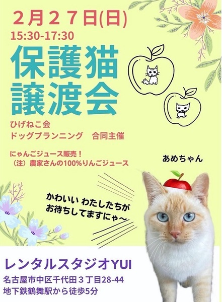 | イベント内容 | ひげねこ会・ドッグプランニング 合同で譲渡会を開催します。 4ヶ月くらいの子猫から大人猫達が参加します。 ☆チャリティ☆ にゃんごジュース販売もあります。 りんご農園さんからの100%果汁ジュースです ドッグプランニング☆インスタグラム https://www.instagram.com/yuko9124/ ひげねこ会HP https://sabuntama.wixsite.com/higenecokai ☆sabuntama インスタグラム https://www.instagram.com/sabuntama/ ☆会場 愛知県 名古屋市中区千代田三丁目28-44 レンタルスタジオYUI(鶴舞高架下) ☆15:30~17:30 JR・地下鉄鶴舞駅から徒歩5分 ☆駐車場 鶴舞交差点~南のJR中央線ガード西側道路は休日駐車禁止解除になっています。 (休日駐禁解除区間に空きが無い場合は、コインパーキングをご利用ください。) 譲渡会についてのお願いです ※入場の際マスク着用・消毒をお願いします。 蜜を避けるため、入場制限をお願いする場合があります。 ※面会時間は15以内でお願いします。 ご不便をおかけしますが、ご理解ご協力よろしくお願いします。 |