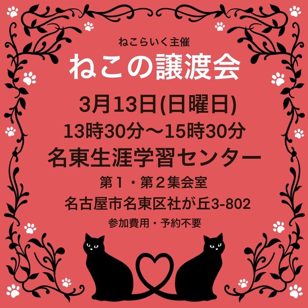 | イベント内容 | 「猫の譲渡会」 日にち:2022年2月13日(日) 時間 :午後1時30分~3時30分 会場 :名東生涯学習センター 名古屋市名東区社が丘3-802 ⚫︎予約・入場料不要です ⚫︎駐車場有(300円/日) 満車の場合は猪高緑地公園駐車場(無料)も ご利用になれます 近隣にコインパーキングがあります。 主催:ねこらいくnenet https://nekonetwork.com/ 募集猫中の猫は https://nekolike.amebaownd.com/ ―------- 上記ブログで紹介しています 猫の急な体調変化により参加できない場合もあります。 ご了承いただきますようお願いします。 ◆実際に猫を見てから考えたい 飼育の仕方について質問したい・・・など すぐに決められない方でも結構です ぜひ、譲渡会におこしください ☆室内飼い、家族全員の同意、治療費の負担など お願いごとがあります ☆1~2週間のお試し飼育期間があります ☆当日、猫を連れて帰ることはできません ※感染症対策を実施しています ・会場入出時の手の消毒、検温にご協力ください ・常時、窓を開け換気をしています ・スタッフはマスクを着用し、ご入場の方にもマ スクの着用をお願いしています ・室内への入場は一定の人数とさせていただきます |