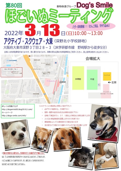 | イベント内容 | 3月13日(日)大阪府大東市の「アクティブ・スクウェア・大東」で、第80回ほごいぬミーティングを開催します。 保護犬を家族に迎えようと考えている方、保護犬に会ってみたい方、保護犬について知りたい方、ぜひご来場ください。 当日は、Dog's smileグッズやワンコ用品の販売、Dog's smileを応援してくださる方々が手作りされた手作り雑貨などの販売も行います。どれもお買い得です。 売り上げは、私たちの活動資金になります。ぜひご協力をお願いします。 なお、来場予定のワンコについては、活動ブログをご確認ください。 来場者のみなさまには、コロナウイルス感染拡大防止に御協力をお願いします。 ・必ずマスクを着用の上、御来場ください。 ・発熱・風邪の症状のある方の入場は御遠慮願います。 ・入口にて検温を行い、37.5℃以上の場合は、入場をお断りします。 ・来場者数により、入場制限を行う場合があります。 ・受付時に「大阪コロナ追跡システム」への御協力をお願いします。 日時 令和4年3月13日(日)午前10時~午後1時 場所 アクティブ・スクウェア・大東 イベントスペース 大阪府大東市深野3丁目28-3 (JR学研都市線野崎駅から西に徒歩5分) 会場には有料駐車場がありますが、数に限りがあります。満車の場合は、近隣のコインパーキングの利用をお願いします。 |