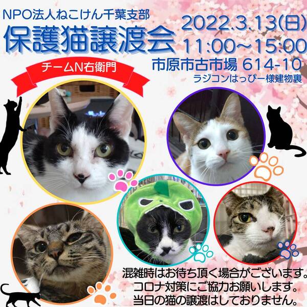 | イベント内容 | 春から夏に生まれ、保護された沢山の子猫達。 元気にスクスク成長し、譲渡会に参加できる準備が整いました。 通常スタイルの譲渡会と致しますが、コロナウイルス対策として ・会場内ではマスクのご着用と入退室の際は消毒をお願い致します。 ・ご予約無しでお越しいただけますが、混雑時は整理券を配らせていただきます。 ご協力の程よろしくお願い致します。 成猫は指名制のお見合いとさせていただく子もおりますので、 『◯◯ちゃんと、お見合い希望』とご指名の事前申し込みをお願い致します。 ねこけん千葉支部のブログ内にありますお問い合わせフォームより、 ⚫︎お名前 ⚫︎ご住所(市区町村までで大丈夫です) ⚫︎お見合いご指名猫の名前を、お知らせください。 ※締め切りは譲渡会前日3月12日(土)18時までとなっております。 ねこけん千葉支部ブログ→ https://ameblo.jp/nekoken-chiba/ また、譲渡会会場では、千葉県内にお住いの預かりボランティアさん及びお世話ボランティアさんを募集しています。 ご希望の方は、大変お手数をおかけしますが、譲渡会までお越しください。 ※ご都合がつかない場合は、お問い合わせ先までご相談ください。 [日時] 3月13日(日)11:00~15:00 [会場] 千葉県市原市古市場614-10 ※屋内での開催となり雨天決行です。 ※抱っこもOK! ※猫ちゃんの負担も考え、ご来場は時間内にお願い致します。 ※特にご予約などは必要ございませんのでご家族皆様でぜひお越し下さい。 ※駐車場あり。 [交通] 交通機関を利用してお越しの方 JR内房線 浜野駅より徒歩13分 浜野駅は、東京駅から京葉線→内房線でおよそ50分の距離!! お車でお越しの方 京葉道路蘇我インターより車で10分 ※駐車場はラジコンショップハッピー様裏手にございます駐車場をご利用ください [譲渡ご希望の方へのお願い] 誠に恐れ入りますが下記に当てはまります方への譲渡は不可となりますので予めご了承下さい。 ①学生さん、未成年の方、安定収入のない方 ②ペットを飼う事を許されていない住宅にお住まいの方 ③身体的、精神的疾病で治療中の方 ※60歳以上の方は別途条件がございますのでご相談下さい。 [譲渡の流れ] お申込み→審査→後日お届け→トライアル→正式譲渡 ※当日のお連れ帰りは出来ませんので予めご了承ください。 ※仮譲渡時にご希望の猫ちゃんにかかった医療費(血液検査・ワクチン・駆虫・不妊去勢手術等)をご負担願います。 しかし、正式譲渡に至らなかった場合は医療費を全額返済致します。 [主催] 動物愛護団体 NPO法人ねこけん 千葉支部 [ブログ] https://ameblo.jp/nekoken-chiba/ [参加動物] 成猫・子猫(ねこけん保護猫以外の猫ちゃんも参加予定です) [お問い合わせ] ご不明な点、ご質問等ございましたら下記までお問い合わせください。 chiba.info@nekoken.jp |
