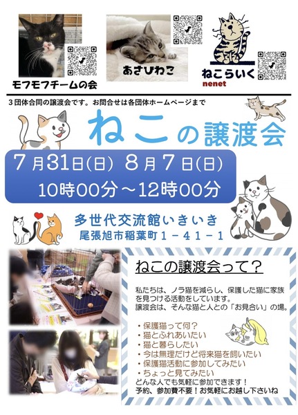 | イベント内容 | 私達は野良猫を減らし、保護した猫に家族を見つける活動をしています! 譲渡会は、そんな猫と人とのお見合いの場。 【ここがポイント】 参加猫は全頭ウイルスチェックを実施しています! 20匹ほど参加です。 【日時】 7月31日(日)10~12時 【場所】 多世代交流館いきいき 尾張旭市稲葉町1-41-1 予約不要 広々駐車場あり 尾張旭市役所の厚意のもと、 地元で活動するモフモフチームの会・あさひねこ、名古屋で活動するねこらいく 3団体共催です。 各団体、譲渡条件があります。 詳しくはお問い合わせください。 なお、当日、猫の引き渡しはしておりません。 後日、ご自宅へお届けとなります。 当日は感染症対策のため、マスクの着用をお願いいたします。 モフモフチームの会 https://instagram.com/jiji_puu?utm_medium=copy_link あさひねこ http://owariasahineko.blog.fc2.com/ ねこらいく https://nekonetwork.com/ 【可愛い猫たちが優しい家族を待っています。会いに来て下さい!】 |