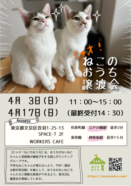 | イベント内容 | 参加する保護猫ちゃんについては、譲渡会一週間前からホームページにてご紹介しております。 https://myaoneko.com 事前予約はできません。 猫ちゃんをお世話することになるご家族皆様でお越しくださると嬉しいです。 譲渡会場でお会いしましょう♪ 【新型コロナウイルス対策について】 会場受付にて、以下の点をお願いする予定です。 ✿マスクの着用 ✿手洗いと消毒 ✿連絡先のご記入 御来場者多数の場合には入場制限を設けさせていただきます。 ※当日沢山のご来場者様がいらっしゃった場合、 整理券をお渡しする事がございます。 会場外で長時間お待たせする場合もございますが ご理解くださいますようお願い致します。 皆さまの長時間の在室を避ける為、 希望者様へは後日のご連絡とさせて頂きます。 ※ 感染防止対策時の特例となります。 ◇譲渡に関してのお願い 【ミャオ!ねこのおうち】では譲渡に際して、以下の要件をお願いしております。 ・完全室内飼いで終生愛育 ・脱走させないための対策 ・不妊去勢手術 ・譲渡誓約書の取り交わし ・医療費の一部ご負担 ※60才以上の方のみのご家庭、独身や、経済的に困難な世帯、 必要な脱走対策を施していただけない方には原則的に譲渡はご遠慮頂いております。 また、保護主により譲渡条件が異なる場合もございますので会場でご相談ください。 参加予定ねこちゃんは、急な体調不良などで不参加になる場合もございます。 【譲渡に関してのお願い】・【医療費の一部のご負担】・【譲渡までの流れ】など 詳しくは下記ホームページをご覧くださいますよう宜しくお願い致します。 ミャオ!ねこのおうち譲渡会 ホームページ https://myaoneko.com |