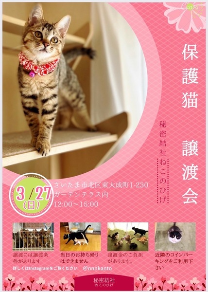 | イベント内容 | 【秘密結社ねこのひげ/保護猫譲渡会】 2/27(日) 12:00~15:00 さいたま市北区東大成町1-230 ガーデンテラス内にて開催します。 家族にするなら保護猫だべ♪♪ こんなご時世だけど新しい家族と共に笑顔で暮らしたい♪ という方は是非会いにいらしてください♡ 新型コロナ対策として 受付名簿のご記入、消毒 マスク着用などのご協力をお願い致します。 物販の方も屋外スペースにて こじんまり置かせて頂きますので ご近所の方はふらりと是非 お立ち寄りくださいませ。 ご不明な点がございましたら インスタグラム @秘密結社ねこのひげ の DMまでお問い合わせ下さい。 |