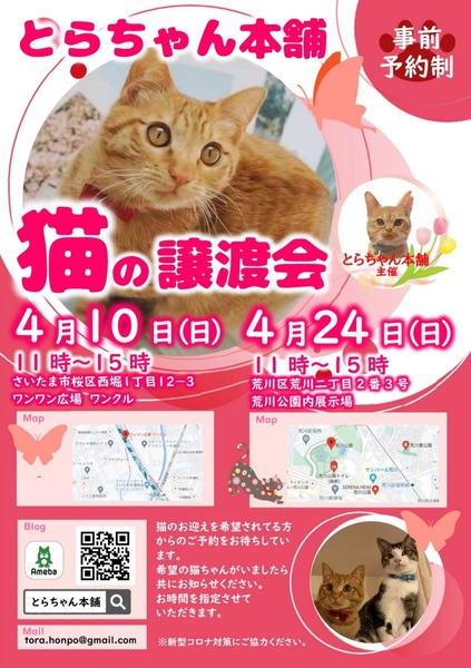 | イベント内容 | とらちゃん本舗 第5回 保護猫・保護犬譲渡会を開催いたします! 4月24日(日) 11:00~15:00 荒川公園内展示場 住所 荒川区荒川区二丁目2番3号 京成線・地下鉄千代田線 町屋駅より徒歩12分 都バス「荒川区役所前」下車 徒歩2分 個人ボランティアが保護している子猫、中猫、成猫様々な世代の子達が沢山参加予定です。 ぜひ足をお運び下さい。 ・緊急事態宣言が出された場合は中止になります。 ・当日咳および発熱の症状のある方はご来場をご遠慮ください。 ・ご参加の際はマスクの着用・アルコール消毒にご協力をお願いいたします。 ・入場前に検温をさせていただき、37℃以上の方はご参加いただけません。 ・事前予約優先制になります。 60分毎入れ替え制各回5組まで ※当日猫ちゃん・ワンちゃんの体調によりお休みになる子がおります。 前日blogにてお知らせいたします。 ※当日のお渡しは出来ません。 ※譲渡にはお願いごとがございます。譲渡条件をご確認下さい。 https://ameblo.jp/torachan-adp/entry-12717827948.html ご予約はこちらまで tora.honpo@gmail.com 以下の点を添えてお申し出ください。 ・お名前・人数 ・希望時間帯 (①11:00~②12:00~③13:00~④14:00~) ・会いたい猫がいれば猫の名前など |