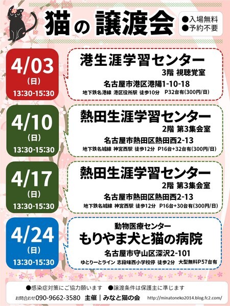 | イベント内容 | =みなと猫の会 第328回譲渡会のお知らせ== ずっとのお家を探している猫を【猫の譲渡会】から迎えませんか ◆ペットショップへ行く前にぜひ譲渡会へ◆ 完全室内暮らしのトレーニングを済ませた猫たちがやってきます ○主 催 みなと猫の会 ○日 時 2022年4月17日(日) 13:30~15:30 ○場 所 熱田生涯学習センター 第3集会室 愛知県名古屋市熱田区熱田西町2-13 地下鉄名城線「神宮西」駅 徒歩12分 ※駐車場有(専用16台 外部30台 いずれも利用料:300円/日) ↓外部コインパーキング(タイムス白鳥公園) https://goo.gl/maps/be4DBuaCwnEY8z6P9 ※お問い合わせは会場ではなく minatonekonokai@gmail.comもしくは 090-9662-3580 まで ○参加猫について ・参加している猫は、ワクチンや駆虫等の基本治療を済ませています。 また、年齢に応じて避妊去勢手術を行っています。 ・参加予定猫が体調不良などで急遽不参加になることもあります。 ○参加猫一覧 http://minatoneko2014.blog.fc2.com/blog-entry-1640.html ○ご来場の皆様へ ・譲渡会の見学は入場無料・予約不要です。 ・当日に猫をお渡しすることはありません。 後日ご自宅までお届けに伺います。 ・一週間から二週間のトライアル期間後、正式譲渡となります。 ・トライアル及び譲渡の際には 完全室内飼い・ご家族の同意・脱走防止策・ アンケート記入など諸条件がございます。 ・里親様には治療費の一部ご負担をお願いしております。 これ以上不幸な猫を増やさないための 治療費とさせて頂きますので何卒ご理解ください。 ・非会員の個人保護者も参加しています。 譲渡条件やトライアルは猫の保護者に準じます。 ・譲渡会の流れ http://minatoneko2014.blog.fc2.com/blog-entry-11.html ○参加猫情報は随時更新中! http://minatoneko2014.blog.fc2.com/blog-entry-493.html ○猫に関する相談も受け付けています ねこについての困りごと、トラブルなどを抱えている方、 相談へいらっしゃいませんか。 ○次回以降の譲渡会予定 日時:4月24日(日) 13:30-15:30 場所:動物医療センター もりやま犬と猫の病院 新館2階 会議室 愛知県名古屋市守山区深沢2-101 ゆとりーとライン「志段味西小学校」バス停留所 徒歩2分 日時:5月1日(日) 13:30-15:30 場所:港生涯学習センター 3階 視聴覚室 名古屋市港区港陽1-10-18 地下鉄名港線「港区役所」駅より徒歩10分 日時:5月7日(土) 13:30-15:30 場所:港生涯学習センター 3階 視聴覚室 名古屋市港区港陽1-10-18 地下鉄名港線「港区役所」駅より徒歩10分 日時:5月15日(日) 13:30-15:30 場所:港生涯学習センター 3階 視聴覚室 名古屋市港区港陽1-10-18 地下鉄名港線「港区役所」駅より徒歩10分 日時:5月22日(日) 13:30-15:30 場所:動物医療センター もりやま犬と猫の病院 新館2階 会議室 愛知県名古屋市守山区深沢2-101 ゆとりーとライン「志段味西小学校」バス停留所 徒歩2分 日時:5月29日(日) 13:30-15:30 場所:熱田生涯学習センター 2階 第3集会室 名古屋市熱田区熱田西町2-13 地下鉄名城線地下鉄「神宮西」駅より徒歩12分 ◎主催者ブログ みなと猫の会 ~こぴっと猫だより~ http://minatoneko2014.blog.fc2.com/ ■上記ブログに会ってみたい猫がいた!でも参加予定猫に入ってない、 どうすればいいの? ■譲渡会当日は都合が悪くて… それ以外の日に猫とお見合いがしたい! などのお問い合わせは minatonekonokai@gmail.com まで 〇感染症の拡大防止にご協力願います ・会場入出時の手の消毒にご協力ください ・定期的に換気作業を行います ・マスク等の使用をお願いします 写真3枚目 くるみ ♀ 3才 ナデナデされるのが大好きです ちょっぴり足短めでキュートな女の子 ☆★個性豊かな猫たちが皆様をお迎えします★☆ 猫とスタッフ一同、お待ちしております |