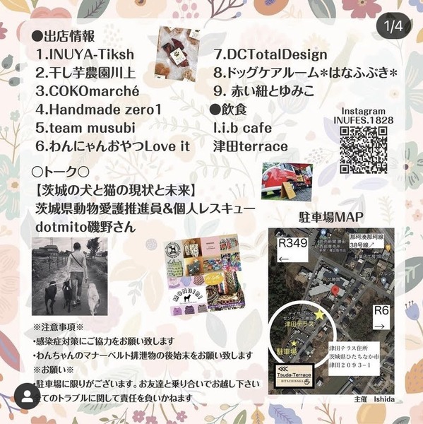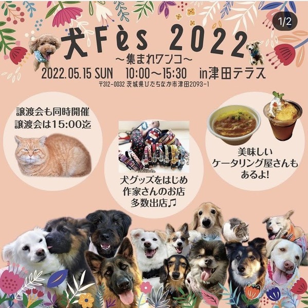| イベント内容 | . ??集まれわんこ!!?? でお馴染みの… 《《犬Fès》》イベント 開催が決定致しました‼️ わんこのみなさまー? お待たせしましたわん??? 2022.05.15(日) 10:00〜 in津田テラス☕️? 雨天決行 ?譲渡会も同時開催致します 繁殖引退犬や飼育放棄猫等、家族を待っている子が参加します。 (猫多め) ご縁が繋がる事を願っての譲渡会です。 (譲渡条件などは保護主さんにより異なります。当日ご確認下さい) 犬Fès情報をチェックしてね! 5/15は津田テラスに大集合‼️‼️ インスタグラムアカウント inufes.1028 https://www.instagram.com/inufes.1028/ 津田テラス住所 〒312-0032 茨城県ひたちなか市津田2093−1 ーーー #犬Fès #車は乗り合いがオススメ #犬Fès2022 #津田テラス #集まれわんこ #譲渡会 もあるよ! #作家さんの出店 もあるよ! #カメラマン も来るよ! #わん友 と遊びにきてね! #雨天決行 |