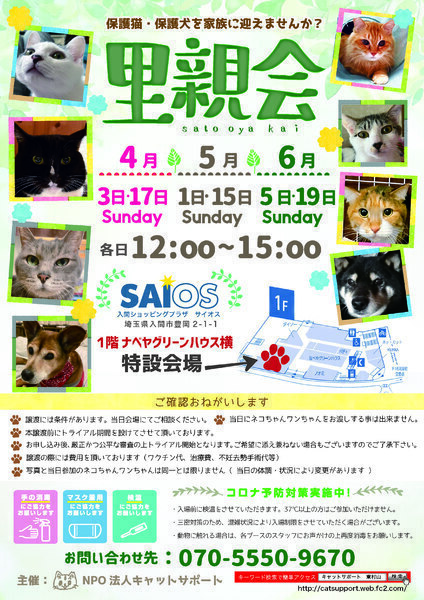 | イベント内容 | 入間駅近くのショッピングプラザ、サイオスで保護猫・保護犬の里親会を開催いたします! ◎6月19日 ・ご参加の際はマスクの着用は必須・アルコール消毒にご協力をお願いいたします。 ・入場前に検温をさせていただきます。37℃以上の方はご参加いただけません。 ・三密対策のため、混雑状況により入場制限をさせていただく場合がございます。 ※猫ちゃん・ワンちゃんの体調・天候により時間変更・中止になる場合が御座います。 ※当日に猫ちゃん・ワンちゃんをお渡しする事は出来ません。譲渡には条件があり、詳細は当日会場にてご相談ください。 |