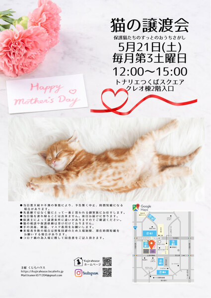 | イベント内容 | ★【毎月第3土曜日】 定期開催しています♪ ★ 個人ボランティアが集まって保護猫たちのずっとのおうちを探します。 参加する猫達は全て医療にかけられた子達です。 一頭の里親という選択をするともう一頭の子が救えます。 お家を持たない猫達が家族を求めて参加します。 保護猫を家族に迎えてください。 ☆当日はチャリティー品販売もあります。売上は全て保護猫達の為に使わせて頂きます。 ☆保護猫たちの為にご支援をお願いします。 犬猫用ドライフードやウエットフード おやつ(未開封、賞味期限内の物) ホッカイロ フェイスタオル バスタオル(洗濯済みの物) をご支援頂けると有難いです。ボランティアの保護猫達や茨城県動物指導センターへ届けます。 ⚠︎お願い⚠︎ 当日はコロナ対策をしお迎え致しますが、来場者の皆様にも検温、消毒、マスク着用をお願いしております。蜜を避ける為に退出をお願いする場合も御座いますがなにとぞご理解ください。 沢山の猫たちが皆様のご来場をお待ちしております! |