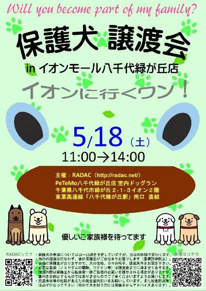| イベント内容 | 犬猫個人保護サポート「RADAC」主催で、2019年5月18日に東葉高速線八千代緑が丘駅直結「イオンモール八千代緑が丘店 PeTeMo」にて「保護犬の譲渡会」を開催します。 とっても可愛い保護犬保護が家族との出逢いを待っています。 保護犬と皆さまに素敵なご縁がありますように・・ 可愛い参加犬と会場についてはRADACホームページ(http://www.radac.net/)をご覧ください。 皆さまのお越しをお待ちしております。 |