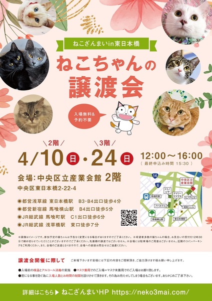 | イベント内容 | ~保護ねこちゃんを家族に迎えませんか?~ 「猫も!里親さんも!保護主も!みんなが笑顔になれる」そんな譲渡会になると良いな♪ 猫ちゃんと里親の赤い糸のご縁結び、どうぞねこざんまいにお手伝いさせて下さい♪ 新しい家族と猫たちの生活が楽しく素敵な毎日でありますように。 そんな生活が送れるよう保護主のサポートも万全です! 【新型コロナウィルス感染予防対策について】 譲渡会開催に際し、ご来場下さいます皆様には以下の内容をご理解頂き、ご協力頂けます様お願い申し上げます。 ●入場前の検温とアルコール消毒の実施 ●マスク着用でのご入場=マスク未着用でのご入場はお断り致します ●入場人数の制限 ●時間の制限=密になる事を防ぐ為にお時間の制限を設けさせて頂きます(入れ替え制) その為お待たせしてしまう場合もございます ●会場利用規約により、皆様のご連絡先を控えさせていただきます あらかじめご了承下さい。 里親様決定は14時以降となります。 決定された方は当日説明会にご参加頂きますので、お時間に余裕を持ってご来場下さい。 11:30より、2階会場入口にて受付を開始します。 受付時に入場予定時間が記入された整理券をお配り致しますので、 整理券を受け取った方はお時間になりましたら2階会場入口に番号順にお並び下さい。 ※11:30より早くいらしても、お待ちいただく場所がございません。 また、近隣にお住まいの方や他階フロアのご利用者様にご迷惑となる場合がございますので、 受付開始時間にあわせてお越しくださいますよう、何卒ご協力お願い致します。 また、ねこざんまい譲渡会は先着順で里親様を決定する譲渡会ではありません。 先に申込みをした方を優先することもありません。 お話をして、その猫ちゃんに合ったおうちに決めさせていただいております。 12時に開場し、里親様の決定は14時以降となります。 14時以降にご入場の場合、希望の猫ちゃんが決定している可能性があります。 また1頭に対し多数の申込みをいただいた場合、早めに申込みを締め切らせていただく場合がございますので、予めご了承下さい。 開催日 2022年4月10日(日)12:00~16:00(最終申込み15:30) 『 東日本橋会場 』 ☆☆☆予約不要・入場無料☆☆☆ 会場 中央区立産業会館2階 中央区東日本橋2-22-4 ※会場へのお問合せはご遠慮ください。 交通 都営浅草線 東日本橋駅 B3又はB4出口 徒歩4分 都営新宿線 馬喰横山駅 B4出口 徒歩5分 JR総武線 馬喰町駅 C1出口 徒歩6分 JR総武線 浅草橋駅 東口 徒歩7分 ※駐車場のご用意はございません。 近隣のコインパーキングをご利用ください。 ホームページ参加猫一覧はこちらから http://www.neko3mai.com/entrycats/entrycats.html ☆子猫希望の里親様☆ 子猫は下痢等により数時間対応ができなかっただけでも死に至る場合があります。 その為、ねこざんまいでは月齢によりお留守番時間の長さを制限させていただきます。 また、子猫ちゃん(6ヶ月未満)の里親様には子猫支援金のご協力をお願い致しております。 ☆ねこざんまいの譲渡会にご来場の里親様☆ 先着順ではございませんので、どうぞ譲渡会開始時間にご来場下さい。 ・譲渡会の流れはこちらから http://www.neko3mai.com/flow/flow.html ・譲渡の際にはいくつかのお約束事がございます。 http://www.neko3mai.com/condition/condition.html ・家族に迎える猫ちゃんが決まった場合、後日里親様のご自宅までお届けいたします。 当日に猫ちゃんをお渡しすることはできませんのでご了承ください。 ☆里親希望のみなさまへ☆ ご家族の皆様で生涯、家族の一員としてたっぷり愛情を注いでくださることを希望しています。 恐れ入りますが ●学生の方、子猫・幼猫希望の60才以上の方のみのご家庭 ●脱走防止対策にご協力いただけない方 は原則譲渡を遠慮させていただいております。 ●一人暮らし・同棲(事実婚)の方 保護主の希望や猫の年齢・性格等により、ご希望に添えない場合もございます。 ☆ご負担頂く費用☆ 譲渡の際に、医療費の一部、お届け時の交通費を里親様にご負担頂いております。 皆様のご協力により、より多くの猫達を救うことができております。 里親様の温かいお気持ちにボランティア一同、心より感謝いたしております。 ご負担頂く医療費につきましてはホームページに詳しく記載させて頂いております。 http://www.neko3mai.com/flow/flow.html ☆よくある質問☆ ・譲渡の条件 ・ご負担頂く費用 ・譲渡会の場所等は ホームページに詳しく掲載させて頂いておりますのでご覧ください。 https://neko3mai.com/ メールでのお問い合わせはすぐにご返答出来ない場合がございますのでご了承ください。 ホームページ https://neko3mai.com/ お問い合わせ http://www.neko3mai.com/contact/form_general.html ねこざんまいブログ http://ameblo.jp/neko3mai/ |