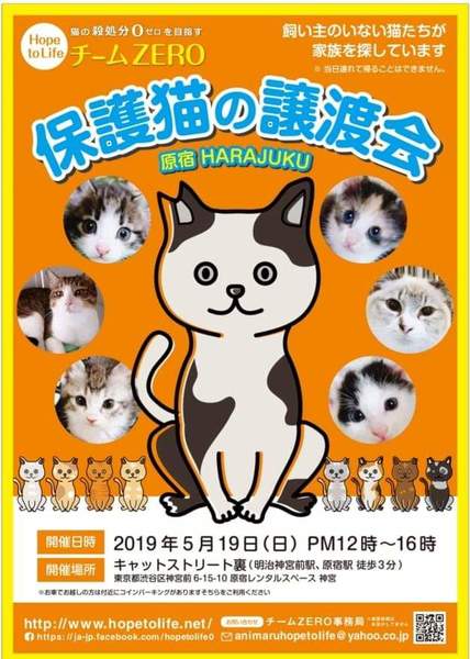 | イベント内容 | Hope to Life ~ 命に希望を 主に埼玉県動物指導センターに収容されてしまった負傷猫 過酷なお外で空腹や痛みに耐え生きている子たち 飼い主の身勝手な都合で捨てられてしまった子たちに 新しい希望の光、命の風を届けようと開催する譲渡会です。 Hope to Life ~いのちに希望を~ ※当日、譲渡会会場での猫のお渡しは致しません。 ※猫の譲渡に際しましては譲渡規約がございます。 |