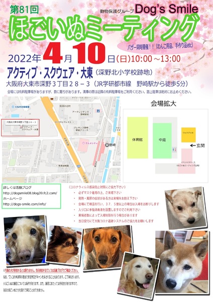 | イベント内容 | 4月10日(日)、大阪府大東市の「アクティブ・スクウェア・大東」で、第81回ほごいぬミーティングを開催します。 保護犬を家族に迎えようと考えている方、保護犬に会ってみたい方、保護犬について知りたい方、ぜひご来場ください。 当日は、Dog's smileグッズやワンコ用品の販売、Dog's smileを応援してくださる方々が手作りされた手作り雑貨などの販売も行います。どれもお買い得です。 売り上げは、私たちの活動資金になります。ぜひご協力をお願いします。 なお、来場予定のワンコについては、活動ブログをご確認ください。 来場者のみなさまには、コロナウイルス感染拡大防止に御協力をお願いします。 ・必ずマスクを着用の上、御来場ください。 ・発熱・風邪の症状のある方の入場は御遠慮願います。 ・入口にて検温を行い、37.5℃以上の場合は、入場をお断りします。 ・来場者数により、入場制限を行う場合があります。 ・受付時に「大阪コロナ追跡システム」への御協力をお願いします。 日時 令和4年4月10日(日)午前10時~午後1時 場所 アクティブ・スクウェア・大東 イベントスペース 大阪府大東市深野3丁目28-3 (JR学研都市線野崎駅から西に徒歩5分) 会場には有料駐車場がありますが、数に限りがあります。満車の場合は、近隣のコインパーキングの利用をお願いします。 |