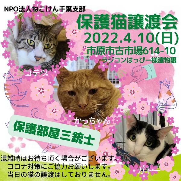 | イベント内容 | 子猫から大人猫まで、沢山の保護猫達が譲渡会に参加します♪ 通常スタイルの譲渡会と致しますが、コロナウイルス対策として ・会場内ではマスクのご着用と入退室の際は消毒をお願い致します。 ・ご予約無しでお越しいただけますが、混雑時は整理券を配らせていただきます。 ご協力の程よろしくお願い致します。 成猫は指名制のお見合いとさせていただく子もおりますので、 『◯◯ちゃんと、お見合い希望』とご指名の事前申し込みをお願い致します。 ねこけん千葉支部のブログ内にありますお問い合わせフォームより、 ⚫︎お名前 ⚫︎ご住所(市区町村までで大丈夫です) ⚫︎お見合いご指名猫の名前を、お知らせください。 ※締め切りは譲渡会前日4月9日(土)18時までとなっております。 ねこけん千葉支部ブログ→ https://ameblo.jp/nekoken-chiba/ また、譲渡会会場では、千葉県内にお住いの預かりボランティアさん及びお世話ボランティアさんを募集しています。 ご希望の方は、大変お手数をおかけしますが、譲渡会までお越しください。 ※ご都合がつかない場合は、お問い合わせ先までご相談ください。 [日時] 4月10日(日)11:00~15:00 [会場] 千葉県市原市古市場614-10 ※屋内での開催となり雨天決行です。 ※抱っこもOK! ※猫ちゃんの負担も考え、ご来場は時間内にお願い致します。 ※特にご予約などは必要ございませんのでご家族皆様でぜひお越し下さい。 ※駐車場あり。 [交通] 交通機関を利用してお越しの方 JR内房線 浜野駅より徒歩13分 浜野駅は、東京駅から京葉線→内房線でおよそ50分の距離!! お車でお越しの方 京葉道路蘇我インターより車で10分 ※駐車場はラジコンショップハッピー様裏手にございます駐車場をご利用ください [譲渡ご希望の方へのお願い] 誠に恐れ入りますが下記に当てはまります方への譲渡は不可となりますので予めご了承下さい。 ①学生さん、未成年の方、安定収入のない方 ②ペットを飼う事を許されていない住宅にお住まいの方 ③身体的、精神的疾病で治療中の方 ※60歳以上の方は別途条件がございますのでご相談下さい。 [譲渡の流れ] お申込み→審査→後日お届け→トライアル→正式譲渡 ※当日のお連れ帰りは出来ませんので予めご了承ください。 ※仮譲渡時にご希望の猫ちゃんにかかった医療費(血液検査・ワクチン・駆虫・不妊去勢手術等)をご負担願います。 しかし、正式譲渡に至らなかった場合は医療費を全額返済致します。 [主催] 動物愛護団体 NPO法人ねこけん 千葉支部 [ブログ] https://ameblo.jp/nekoken-chiba/ [参加動物] 成猫・子猫(ねこけん保護猫以外の猫ちゃんも参加予定です) [お問い合わせ] ご不明な点、ご質問等ございましたら下記までお問い合わせください。 chiba.info@nekoken.jp |