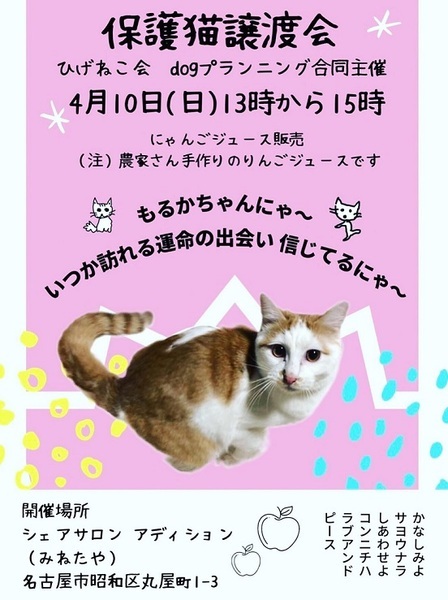 | イベント内容 | ひげねこ会・ドッグプランニング 合同で譲渡会を開催します。 5ヶ月くらいの子猫から大人猫達が参加します。 ☆チャリティ☆ にゃんごジュース販売もあります。 りんご農園さんからの100%果汁ジュースです ドッグプランニング☆インスタグラム https://www.instagram.com/yuko9124/ ひげねこ会HP https://sabuntama.wixsite.com/higenecokai ☆sabuntama インスタグラム https://www.instagram.com/sabuntama/ ☆会場 愛知県名古屋市昭和区丸屋町1-3 ネイルサロン Minetaya ☆13:00~15:00 駐車場は、コインパーキングをご利用下さい。 事前の予約は不要です。 皆さんお待ちしています☆ |