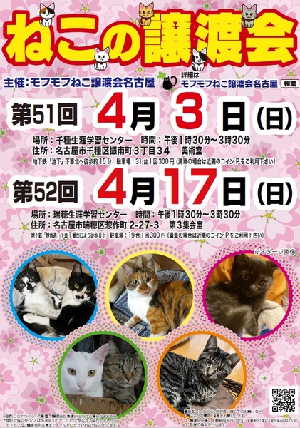 | イベント内容 | モフモフねこ譲渡会名古屋 猫たちの幸せなお家探しのために譲渡会を開催しております。 個人ボランティアの集まりです。 自分たちの出来ることから頑張っております! 一匹でも幸せになれる猫が増えますように 場所 瑞穂生涯学習センター 第3集会室 住所 名古屋市瑞穂区惣作町2-27-3 時間 13時30分~15時30分 交通機関等 地下鉄「妙音通」下車1番出口より徒歩8分 駐車場19台(満車の場合は近隣コインPをご利用ください) 参加猫の情報は下記モフモフねこ譲渡会名古屋ブログにてご確認ください。 https://mofumofuneko4.fc2.net/ 新型コロナウイルス対策として ・会場は換気を定期的に行います。 ・密を避けるため、入場制限をさせていただきます。 ・入口にて手指の消毒、検温をお願いいたします。 ・ご来場の際はマスク着用をお願いいたします。 ・咳・発熱・倦怠感等の体調のすぐれない方はご来場を控えていただきますよう、お願いいたします。 ・新型コロナウイルスの影響により急遽中止になる場合もありますので、モフモフねこ譲渡会名古屋ブログにてご確認の上、ご来場ください。 【譲渡会について】 ・譲渡会は入場無料、予約不要です。お気軽にご参加ください。 ・会場へのお問い合わせはご遠慮ください。 ご質問は下記メールアドレスへお願いいたします。 mofumofuneko4☆gmail.com ☆を@に変更してお問い合わせください。 ・猫の引き取りはしておりません。 ・譲渡会当日に猫をお渡しすることはありません。 ・保護主によって譲渡条件が違う場合があります。 ・参加予定でも譲渡会前にトライアルになる場合があります。 ご希望の猫がいましたらまずはお問い合わせをお願いいたします。 【参加猫について】 ・ノミ駆除、駆虫、トイレ躾、ワクチン3種接種済。 ・年齢や健康状態に応じて、避妊手術を行っております。 ・参加予定で紹介していても当日体調不良等で欠席になる場合があります。 【譲渡の約束事】 ・ペット飼育可の住宅にお住まいの方。 ・完全室内飼育。 ・脱走防止の対策をしていただける方。 ・避妊手術未実施の場合、避妊手術 の実施と報告をしていただける方。 ・ご家族全員が猫を飼うことに同意していること。 ・譲渡後、しばらく定期連絡を入れていただける方。 *お一人暮らしの方、60歳以上の方は、身内の方の保証が必要となる場合がございます。 #名古屋瑞穂区 #瑞穂生涯学習センター #譲渡会 #保護猫 #地域猫 #さくらねこ #tnr #里親募集 #里親募集中 #猫 #ねこ #殺処分ゼロ #買わずに飼おう #モフモフねこ譲渡会名古屋 #ペットショップに行く前に #譲渡会のお知らせ #猫と暮らしたい |