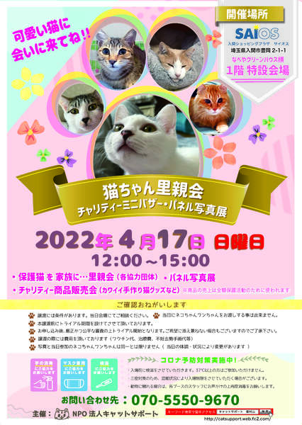 | イベント内容 | 入間駅近くのショッピングプラザ、サイオスで保護猫里親会を開催いたします! 当日は会場でチャリティーミニバザーと写真パネル展も同時開催! ぜひ皆様お誘いあわせの上、ご来場をお待ちしております。 日時:2022年4月17日(日) 12:00~15:00 ・ご参加の際はマスクの着用は必須・アルコール消毒にご協力をお願いいたします。 ・入場前に検温をさせていただきます。37℃以上の方はご参加いただけません。 ・三密対策のため、混雑状況により入場制限をさせていただく場合がございます。 ※動物の体調・天候により時間変更・中止になる場合が御座います。 ※当日に動物をお渡しする事は出来ません。譲渡には条件があり、詳細は当日会場にてご相談ください。 ※バザー商品の売上は全額保護活動のために使われます。 |