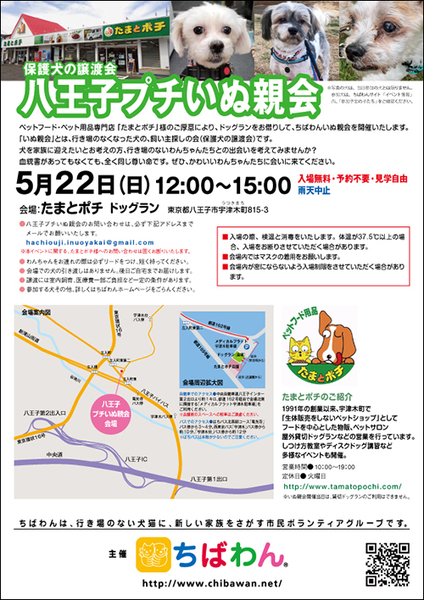 | イベント内容 | 八王子市のペットフード・ペット用品専門店 「たまとポチ」様のドッグランをお借りして、ちばわんいぬ親会(保護犬の譲渡会)を開催いたします。 預かり家庭で保護されている犬たちが、新しい家族との出会いを求めて参加します。予約不要・入場無料ですので、見学だけでもお気軽にお越しください。 【譲渡までの流れやお願い事項などをこちらのページでご確認の上、ご来場ください】 https://chibawan.net/event/20220522-hachiouji-dog ※当日参加する犬などの詳細は上記ちばわんホームページでご確認ください。 ※天候等により中止となる場合があります。開催有無は当日朝8時までに上記ページにてお知らせします。 |