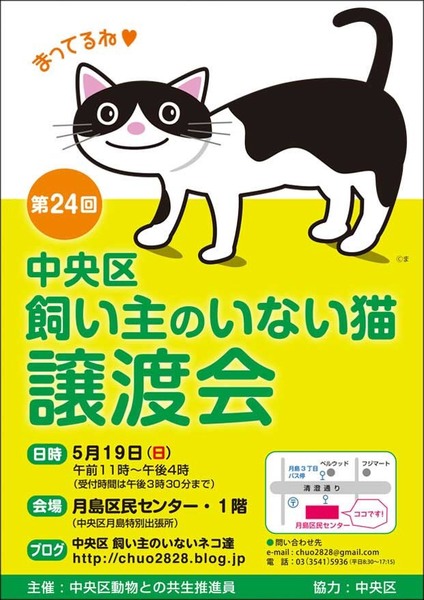 | イベント内容 | 「中央区 飼い主のいない猫 譲渡会」 東京都中央区月島区民センター 1階 会議室で、猫の譲渡会を開催します。 主催 : 中央区動物との共生推進員 協力:中央区保健所 開催日 : 5月19日(日)11時〜16時(最終入場15時30分) 会場 : 東京都中央区月島4丁目1-1 月島区民センター 1階 会議室 地下鉄 有楽町線 月島駅 徒歩3分 地下鉄 大江戸線 月島駅 徒歩3分 ⭐️猫の譲渡に関しては、猫によって譲渡の、条件が異なりますので、会場で保護主と、直接、お話していただくよう、お願いしております。 ⭐️ 仔猫については、体調が不安定な為、留守時間の長い方や、一人暮らしの方などは、お勧めすることができませんので、ご了承ください。 ⭐️当日は、猫を連れて帰ることは、できません。 保護主と、日時を相談していただき、自宅までお届けいたします。 ⭐️参加予定の猫は、体調不良などにより、不参加になることがありますが、ご了承ください。 詳しくは、ブログをご覧ください。 http://chuo2828.blog.jp 【お問い合わせ先】 chuo2828⚫︎gmail.com 又は、 minimyu2014⚫︎yahoo.co.jp ⭐️迷惑メール防止の為、@を⚫︎で表示しています。 【お急ぎの方は】 電話:090-4412-6396 竹内(中央区動物推進員) ご連絡は、昼12時〜夜12時で、お願いします。 |