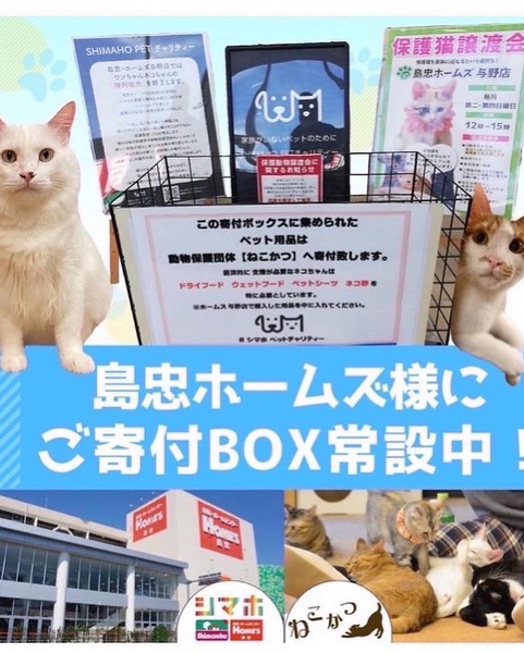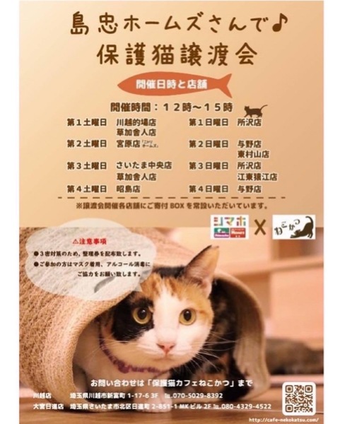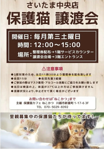 | イベント内容 | 保護猫カフェねこかつさん主催の保護猫譲渡会です? 島忠ホームズさいたま中央店さんでの譲渡会が今月から第3土曜日に復活開催されることになりました★ 保護猫ちゃんのお迎えをお考えの方はぜひお越しください。 当日の11時半より整理券を配布致します。 |